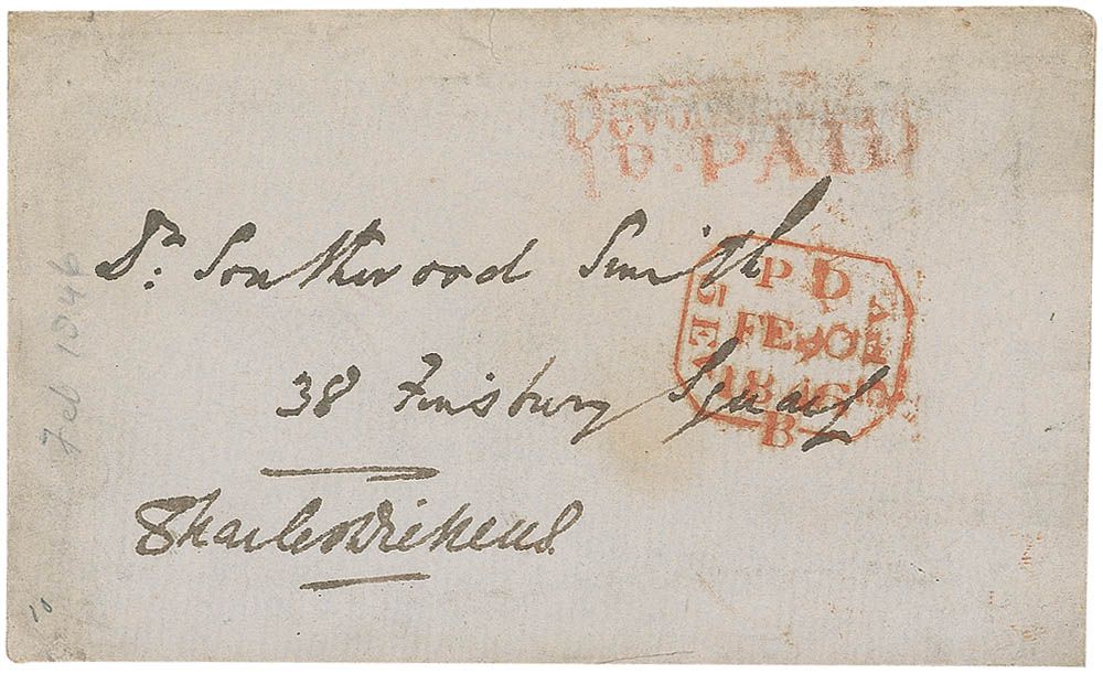 Hand-addressed envelope panel, 4.5 x 2.75, addressed by Dickens to “Dr. Southwood Smith, 38 Finsbury Square,” and signed in the lower left, “Charles Dickens.” Panel is affixed to an identical size sheet with the back of the envelope affixed to the reverse and bearing remnants of a red wax seal. In very good condition, with postmark over portion of address, scattered toning and soiling, and a couple pencil notations. The addressee, Thomas Southwood Smith, was a well-known sanitary reformer. It was during Dickens’ correspondence with Southwood Smith that he came up with the idea for A Christmas Carol.