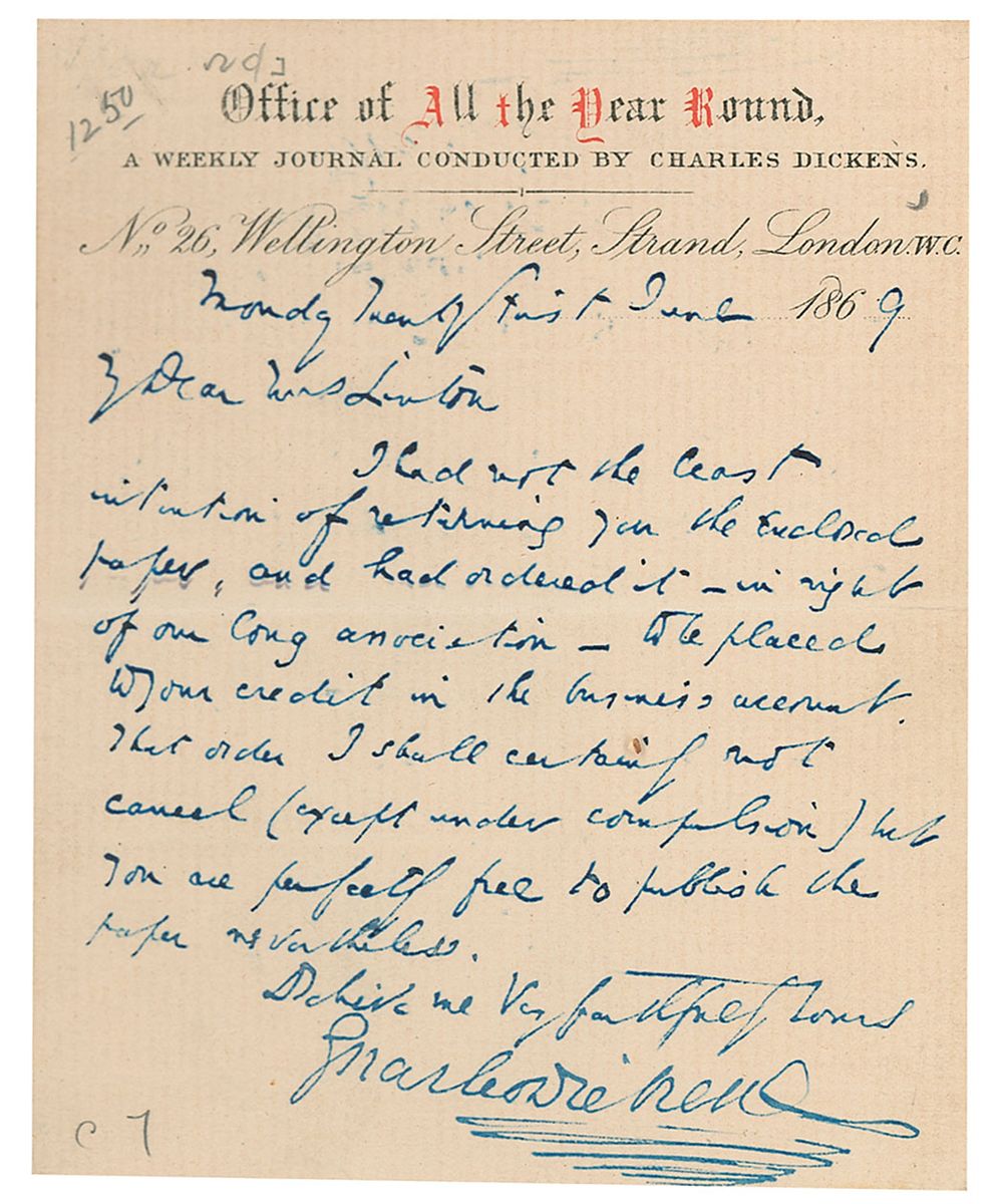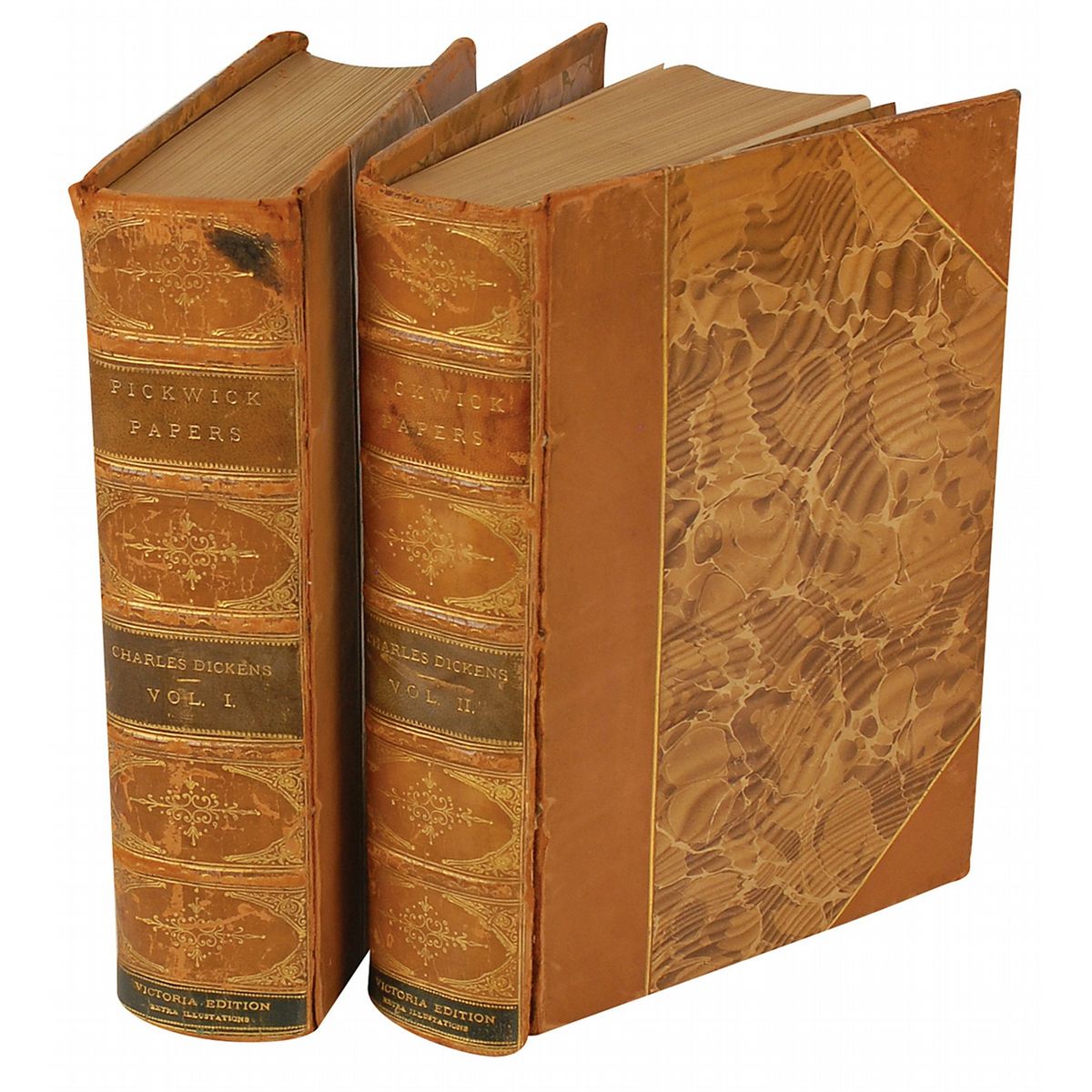 ALS, one page, 4 x 5, Office of All the Year Round letterhead, June 21, 1869. Letter to novelist and journalist Eliza Lynn Linton. In full: “I had not the least intention of returning you the enclosed paper, and had ordered it—in sight of our long association—to be placed to your credit in the business account. That order I shall certainly not cancel (except under compulsion) but you are perfectly free to publish the paper nevertheless.” Letter is affixed by its integral second page to the second free end page of Volume I of the Victoria Edition of The Posthumous Papers of the Pickwick Club, with both volumes present. Autographic condition is fine, with a few pencil notations along top edge and some slight mirroring of ink near top. Book condition: G/None. Beautifully half-bound in tan Moroccan leather and brown marbled paper, with gilted textblock edges and embellishment on spine. Both volumes have worn edges with small tears at corners and spine-ends; splitting hinges; scuffing along spine; light soiling; bookplate and Dickens stamp affixed to front pastedown and fep respectively; tissue pages over illustrations yellowed; few minor spots of foxing. Volume I’s front hinge is entirely split, with the cover reattached from within (ffeps and pastedown stuck together along hinge from excessive glue); also contains pencil notes to second ffep. Volume II’s front cover is entirely split, hanging on by a few threads.