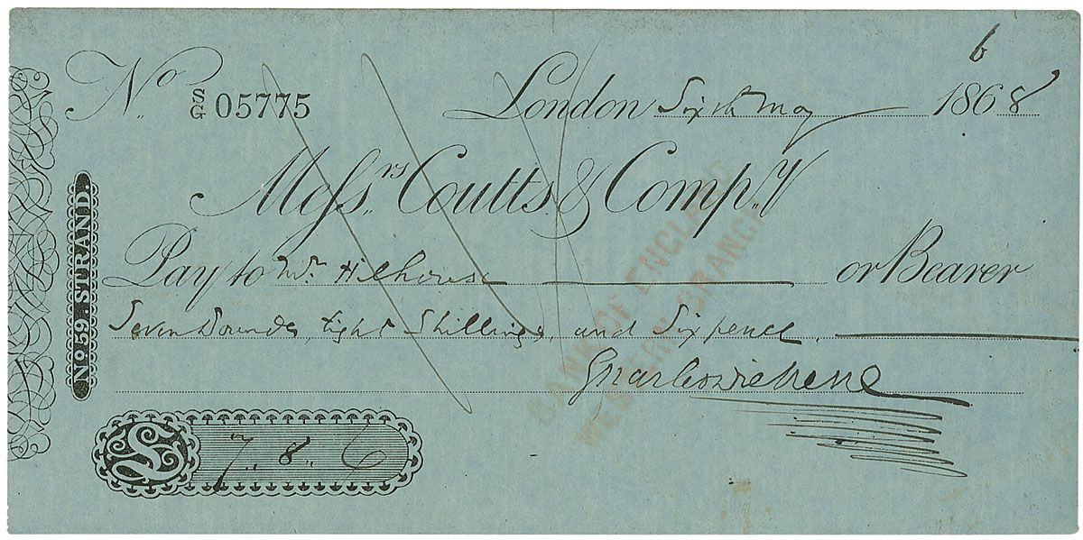 Messrs. Coutts & Company check, 7.5 x 3.75, filled out and signed by Dickens, “Charles Dickens,” payable to Mr. Hilhouse for £7.8.6, May 6, 1868. In very good condition, with two vertical folds, scattered toning and soiling, and expected bank stamps and notations, slightly affecting the signature.