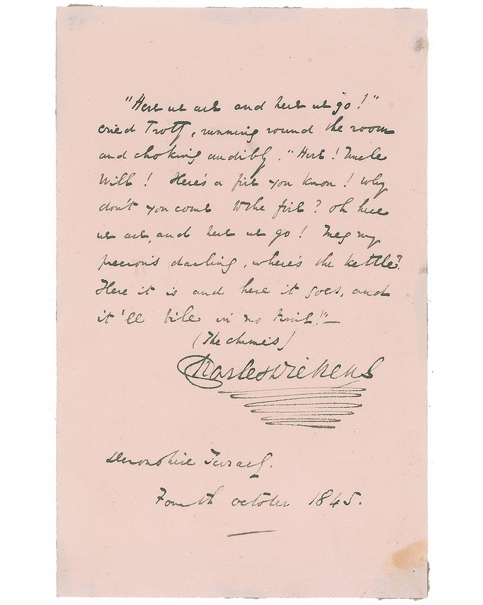 AQS on an off-white 4.5 x 7.25 sheet. Dickens writes a lengthy quote from The Chimes. In full: “'Here we are and here we go!' cried Trotty, running round the room, and choking audibly. 'Here, Uncle Will! Here's a fire you know! Why don't you come to the fire? Oh here we are and here we go! Meg, my precious darling, where's the kettle? Here it is and here it goes, and it'll bile in no time!' (The Chimes).” Signed at the conclusion, “Charles Dickens, Devonshire Terrace, Fourth October 1845.” In fine condition, with some slight edge and corner toning from mounting remnants on reverse, all of which could be matted out. The Chimes: A Goblin Story of Some Bells that Rang an Old Year Out and a New Year In, was written and published by Dickens in 1844, one year after A Christmas Carol. A Christmas Carol had been extremely well received the previous year, and The Chimes aroused public interest and anticipation. Five different stage productions of the book were running within weeks of publication and nearly 20,000 copies were sold in the first three months. It had a high media profile, and was widely reviewed and discussed. It was certainly a financial success for Dickens, and remained popular for many years, although in the long term its fame was eclipsed by that of A Christmas Carol. Quotes directly from any Dicken’s work are quite valuable, and few are so lengthy.