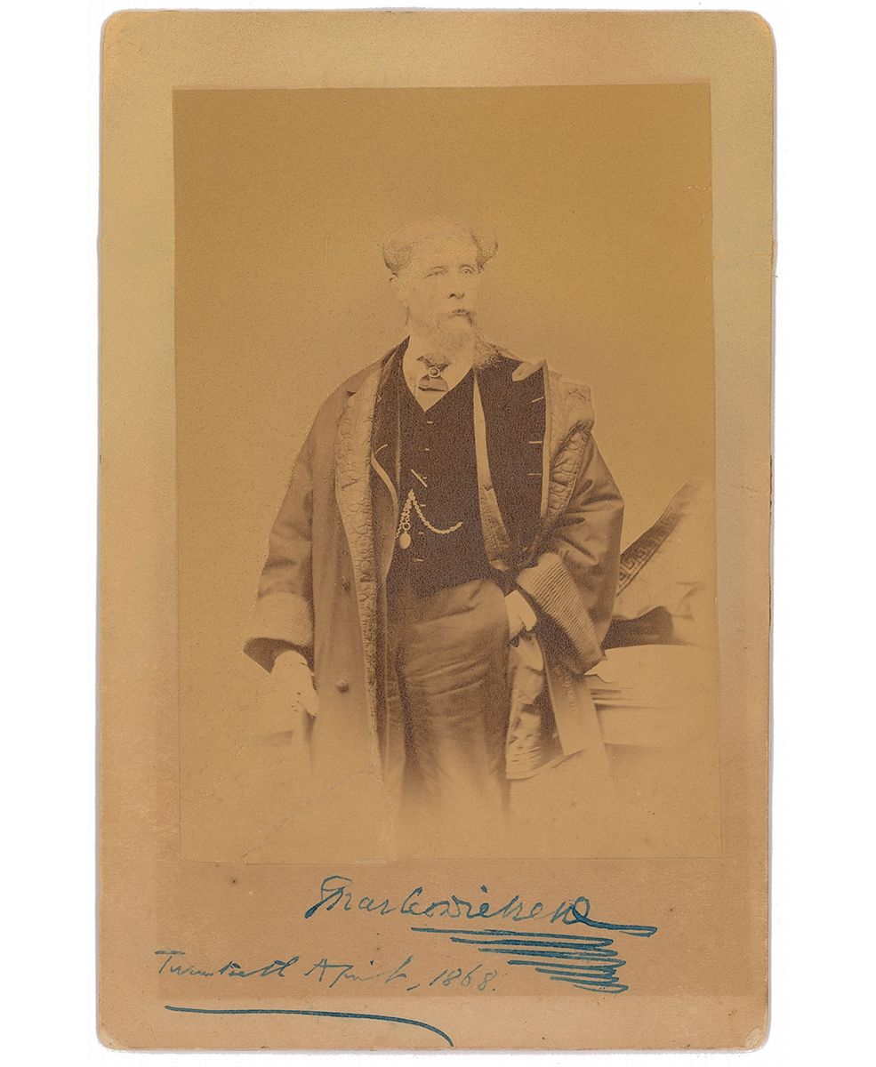 Dickens made his second trip to America in 1867–1868, touring the country and giving public readings along the way, where he was delighted and impressed at the reception given him. On the day he signed this, Dickens performed his last-ever reading in America at Steinway Hall in New York. Upon finishing, the author was hailed with thunderous applause and he gave a brief summation of his thoughts on his time in the United States, saying, 'I shall never recall you as a mere public audience, but rather as a host of personal friends, and ever with the greatest gratitude, tenderness and consideration. Ladies and gentlemen, I beg to bid you farewell. God bless you, and God bless the land in which I leave you.' With that, he left for England out of the port of New York on the following day, never to return. A fantastic image—his manager called it 'the only good photograph of him in existence'—signed on an important date, this is a scarce photo, larger than typically seen, that marks the conclusion of Dickens's journey across the Atlantic.
