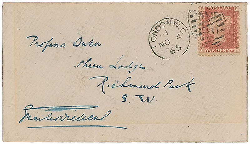 Hand-addressed and signed mailing envelope, 4.75 x 2.75, addressed by Dickens to “Professor Owen, Sheen Lodge, Richmond Park, S. W.,” and signed in the lower left, “Charles Dickens.” Postmarked in the upper right, London, November 4, 1865. A light overall block of toning, otherwise fine condition. Dickens sent this to his friend Richard Owen, a controversial biologist, comparative anatomist, and paleontologist—he is best remembered today for coining the word ‘Dinosaur.’ It was in the same month of November 1865 that Dickens published the final serialized chapters of his last novel, Our Mutual Friend.