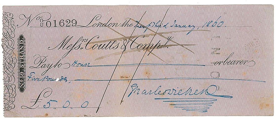 Bank check, 7.25 x 3, filled out and signed by Dickens, payable to House for £5.0.0, January 23, 1860. Several vertical folds, a few passing through signature, ink cancellations to body, and some scattered light toning, otherwise fine condition.