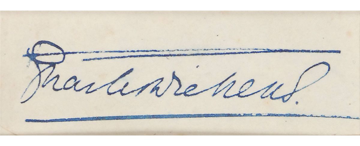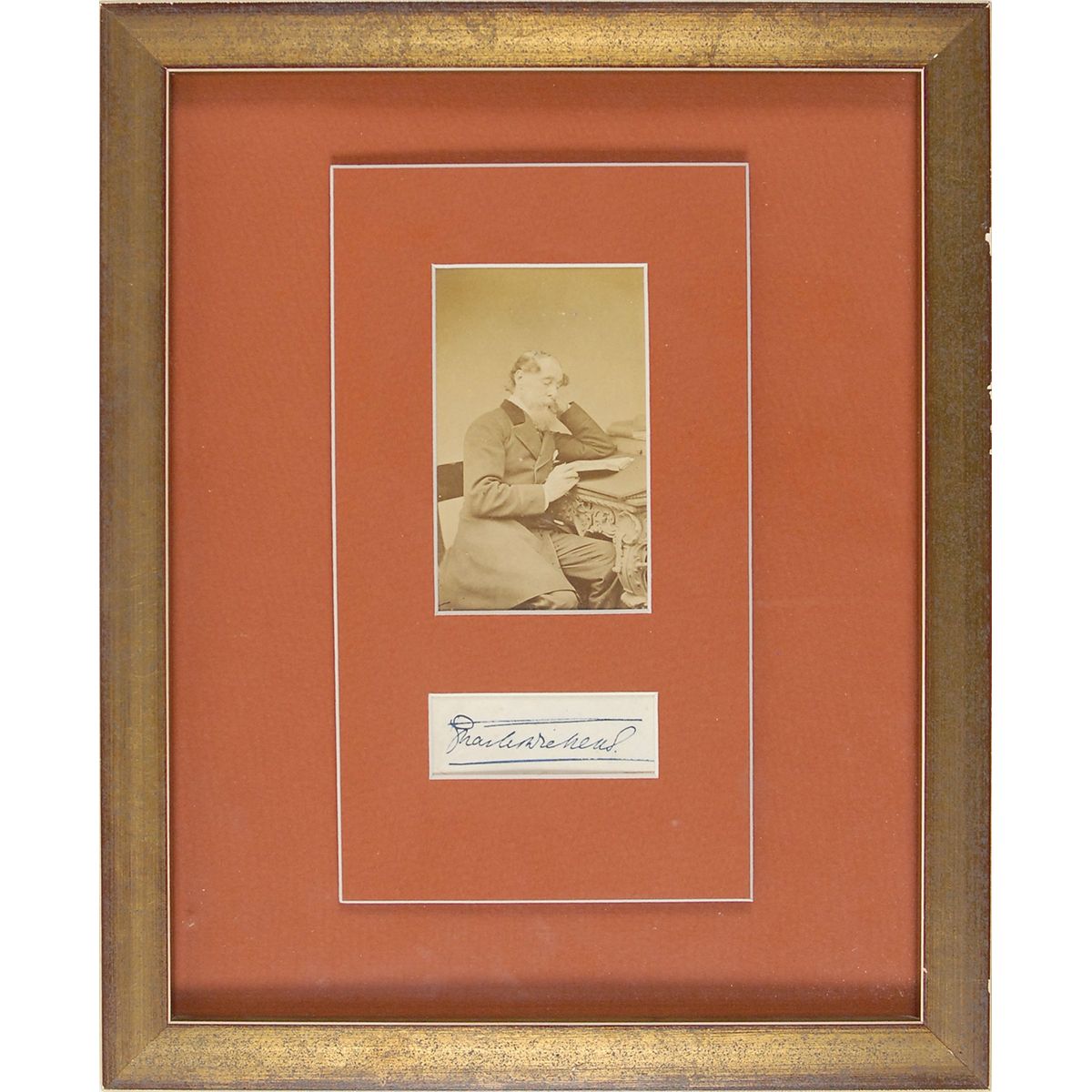 Choice ink signature, “Charles Dickens,” on an off-white slip. Nicely matted and framed with a portrait of Dickens at his desk to an overall size of 9 x 11. In fine, clean condition.