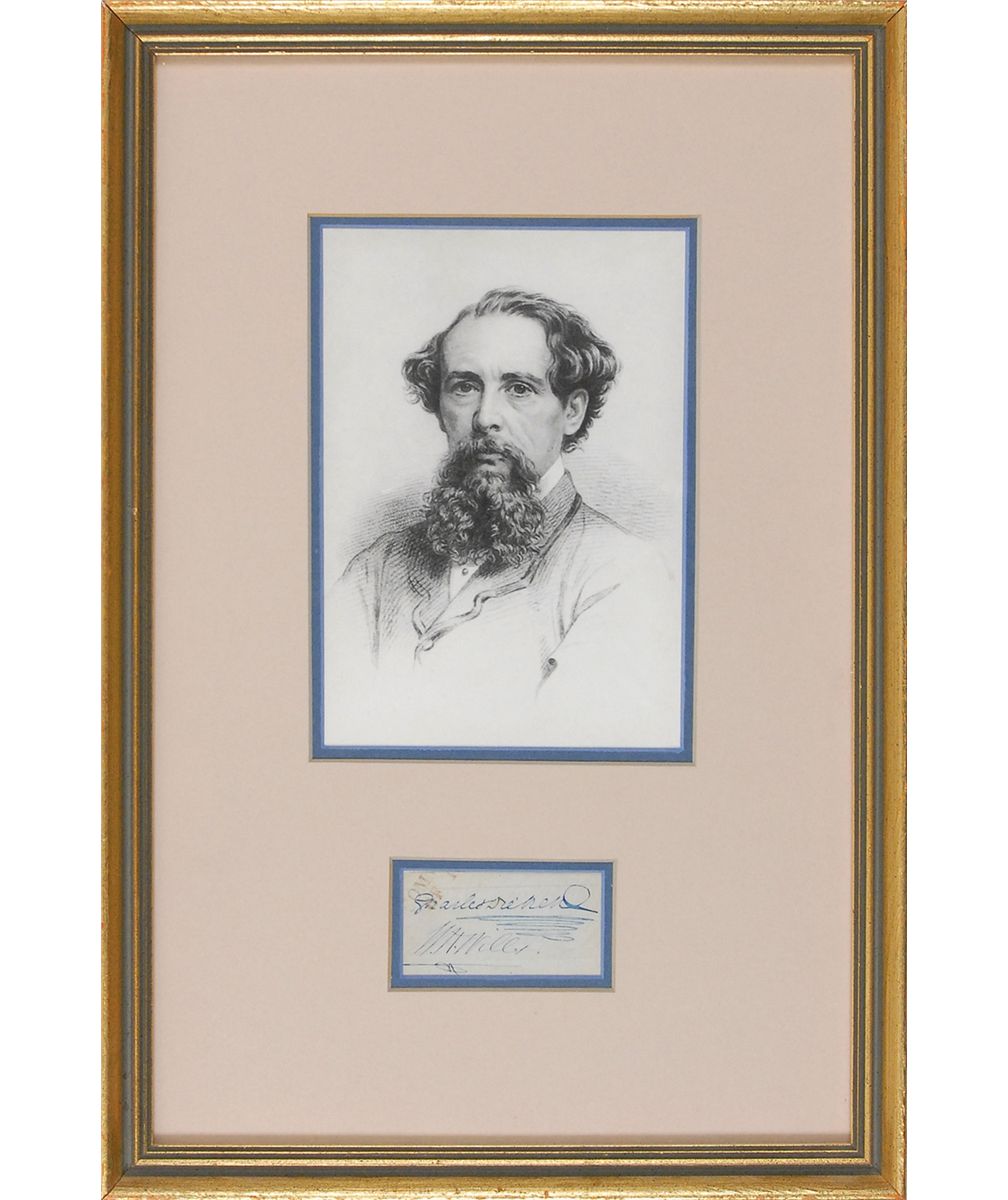Ink signature, “Charles Dickens,” on an off-white 2.5 x 1.25 slip, also signed below by one of his editors, “W. H. Wills.” Handsomely double-matted and framed with an engraved portrait to an overall size of 10 x 14.5. In fine condition, with an ink stamp affecting the first couple letters of Dickens’s signature.