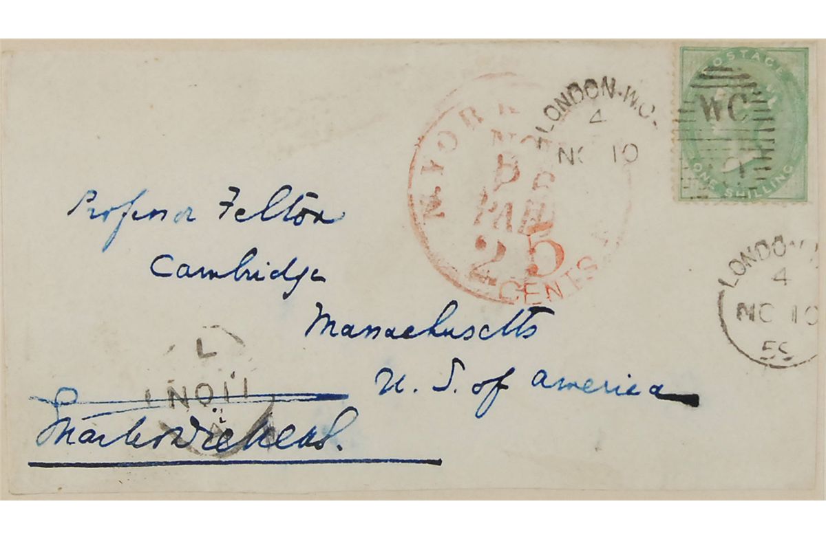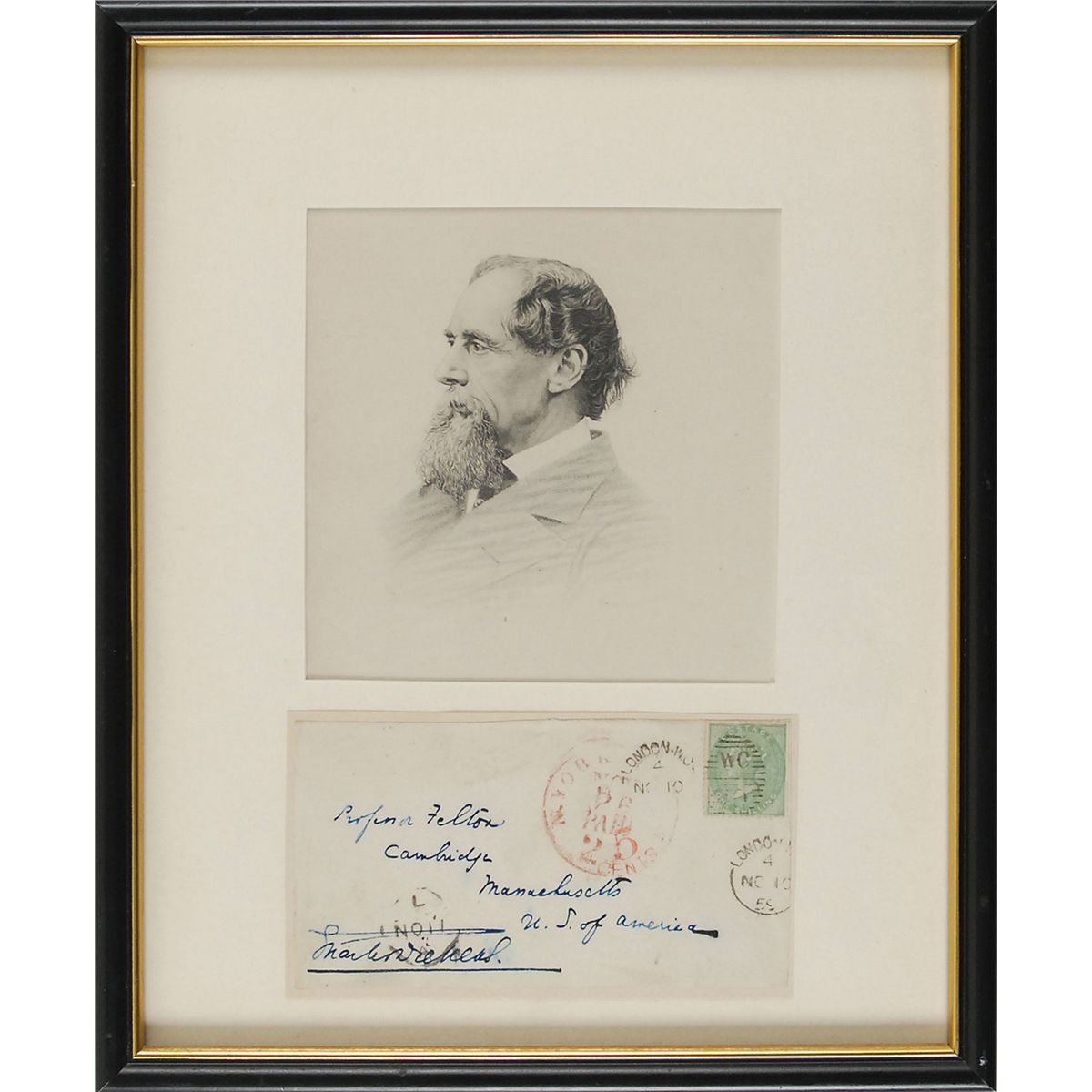Desirable hand-addressed and signed address panel removed from a mailing envelope, 4.75 x 2.5, addressed by Dickens to “Professor Felton, Cambridge, Massachusetts, U. S. of America,” and neatly signed in the lower left, “Charles Dickens.” Postmarked from London on November 10, 1859, and bearing several other cancellations. Nicely matted and framed with an engraved portrait to an overall size of 8.5 x 10.5. Scattered soiling, a cancellation stamp affecting the center of his signature, and slightly trimmed edges, otherwise fine condition. The recipient, Cornelius Conway Felton, was a regent of the Smithsonian Institution and longtime professor of Greek literature at Harvard University; he would become president of Harvard in 1860, heading the esteemed institution until his death in 1862. Dickens had met Felton in Boston during his first trip to America in 1842, and they became close friends. A nice literary and academic association.