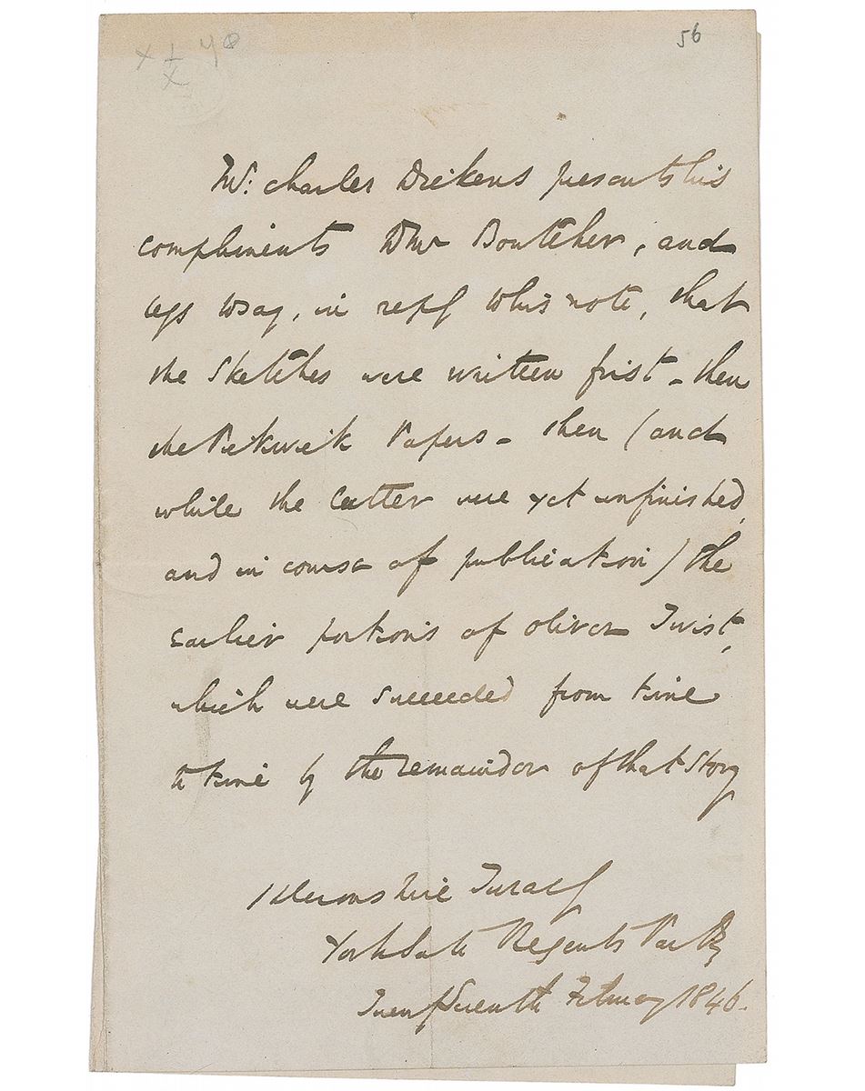 Third-person ALS signed “Mr. Charles Dickens,” one page, 4.5 x 7, February 27, 1846. Letter concerning the chronology of his principal publications. In full: “Mr. Charles Dickens presents his compliments to Mr. Boutcher, and begs to say, in reply to his note, that the Sketches were written first—then the Pickwick Papers—then (and while the latter were yet unfinished, and in course of publication) the earlier portions of Oliver Twist, which were succeeded from time to time by the termination of that story.” In fine condition, with central vertical and horizontal folds and toning along the top edge. Dickens’s earliest publication, Sketches by Boz, was first published in 1836. The Pickwick Papers—written under the pseudonym ‘Boz’—was serialized between April 1836 and November 1837, then published in book form shortly thereafter. Oliver Twist also ran as a serial in Bentley's Miscellany over the course of the next two years, becoming one of his most well-known works. Fantastic content from early in the great writer’s career.