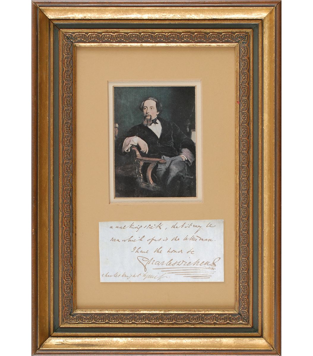 ANS, one page, 4.25 x 2, no date. The conclusion of a longer note, in full: “a walking stick, that may be seen which opens is the Whitman.” Placed against a double-matted portrait of the writer and framed to an overall size of 8.5 x 12. In fine condition.
