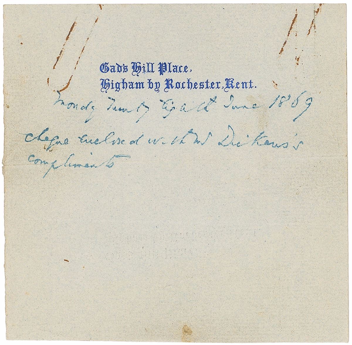 Third-person ANS signed within the text, one page, 4.5 x 4.5, personal Gad’s Hill Place letterhead, June 28, 1869. In full: “Cheque enclosed with Mr. Dickens's compliments.” Rusty paperclip marks to the top edge, light scattered soiling, and evenly trimmed edges, otherwise fine condition.