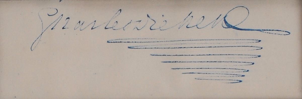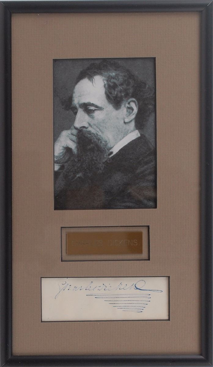 Ink signature, “Charles Dickens,” on an off-white 3.75 x 1.25 clipped slip. Matted and framed with a portrait and nameplate to an overall size of 6.25 x 10.75. In fine condition.