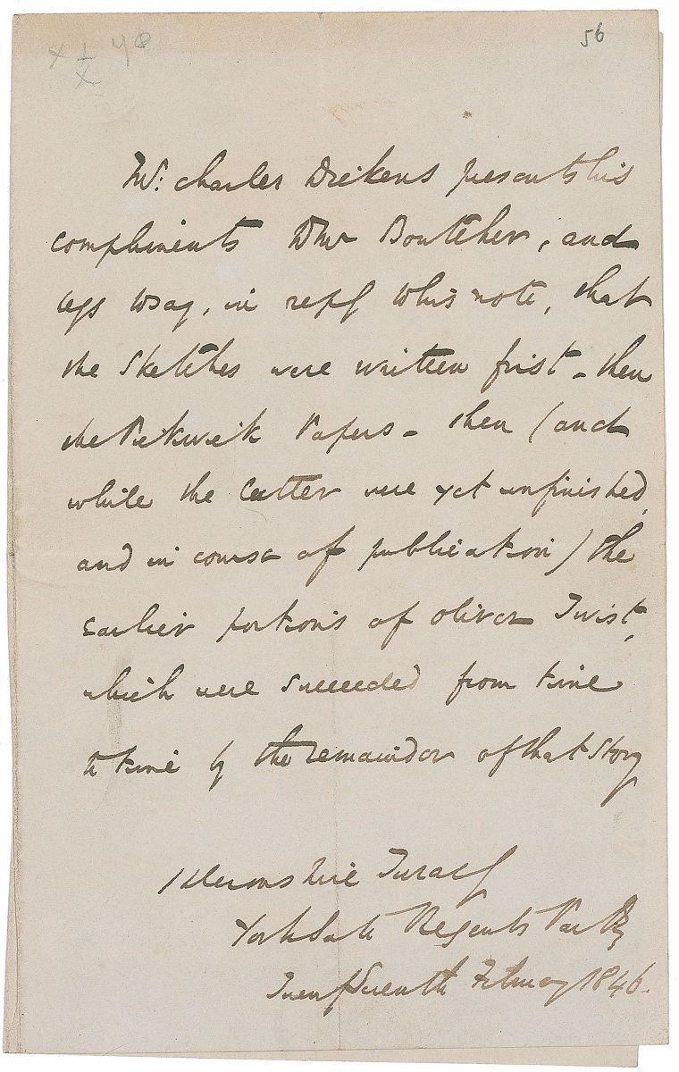 Third-person ALS signed “Mr. Charles Dickens,” one page, 4.5 x 7, February 27, 1846. Letter concerning the chronology of his principal publications. In full: “Mr. Charles Dickens presents his compliments to Mr. Boutcher, and begs to say, in reply to his note, that the Sketches were written first—then the Pickwick Papers—then (and while the latter were yet unfinished, and in course of publication) the earlier portions of Oliver Twist, which were succeeded from time to time by the termination of that story.” In fine condition, with central vertical and horizontal folds and toning along the top edge. Dickens’s earliest publication, Sketches by Boz, was first published in 1836. The Pickwick Papers—written under the pseudonym ‘Boz’—was serialized between April 1836 and November 1837, then published in book form shortly thereafter. Oliver Twist also ran as a serial in Bentley's Miscellany over the course of the next two years, becoming one of his most well-known works. Fantastic content from early in the great writer’s career.
