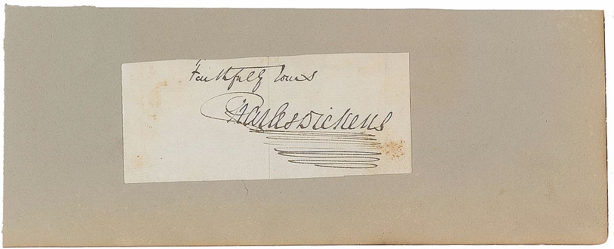 Ink signature, “Faithfully yours, Charles Dickens,” on an off-white 4.5 x 2 slip affixed to a slightly larger scrapbook page. In very good to fine condition, with a central fold and light stains.