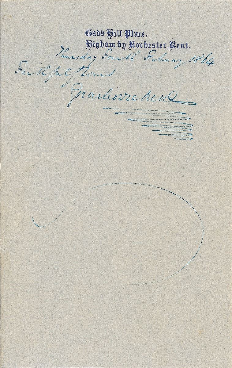 Attractive ink signature, “Thursday Fourth February 1864, Faithfully yours, Charles Dickens,” on an off-white 4.5 x 7 sheet of his personal Gad’s Hill Place letterhead. In fine condition. Accompanied by an unsigned albumen portrait.