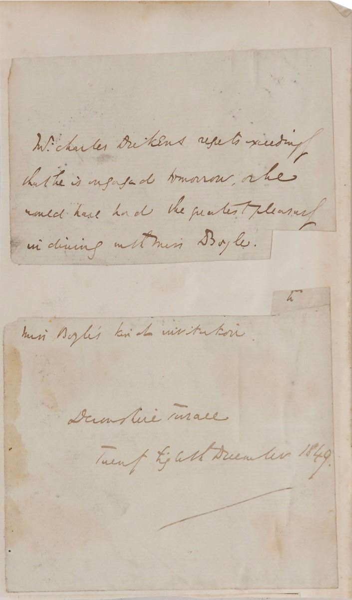 Third-person ANS signed within the text, one page, 4.5 x 6.75, December 8, 1849. In part: “Mr. Charles Dickens regrets exceedingly that he is engaged tomorrow, or he would have had the greatest pleasure in dining with Miss Boyle.” The two fragments have been permanently affixed to a larger sheet and are in very good condition, with light staining, soiling, and wrinkling.