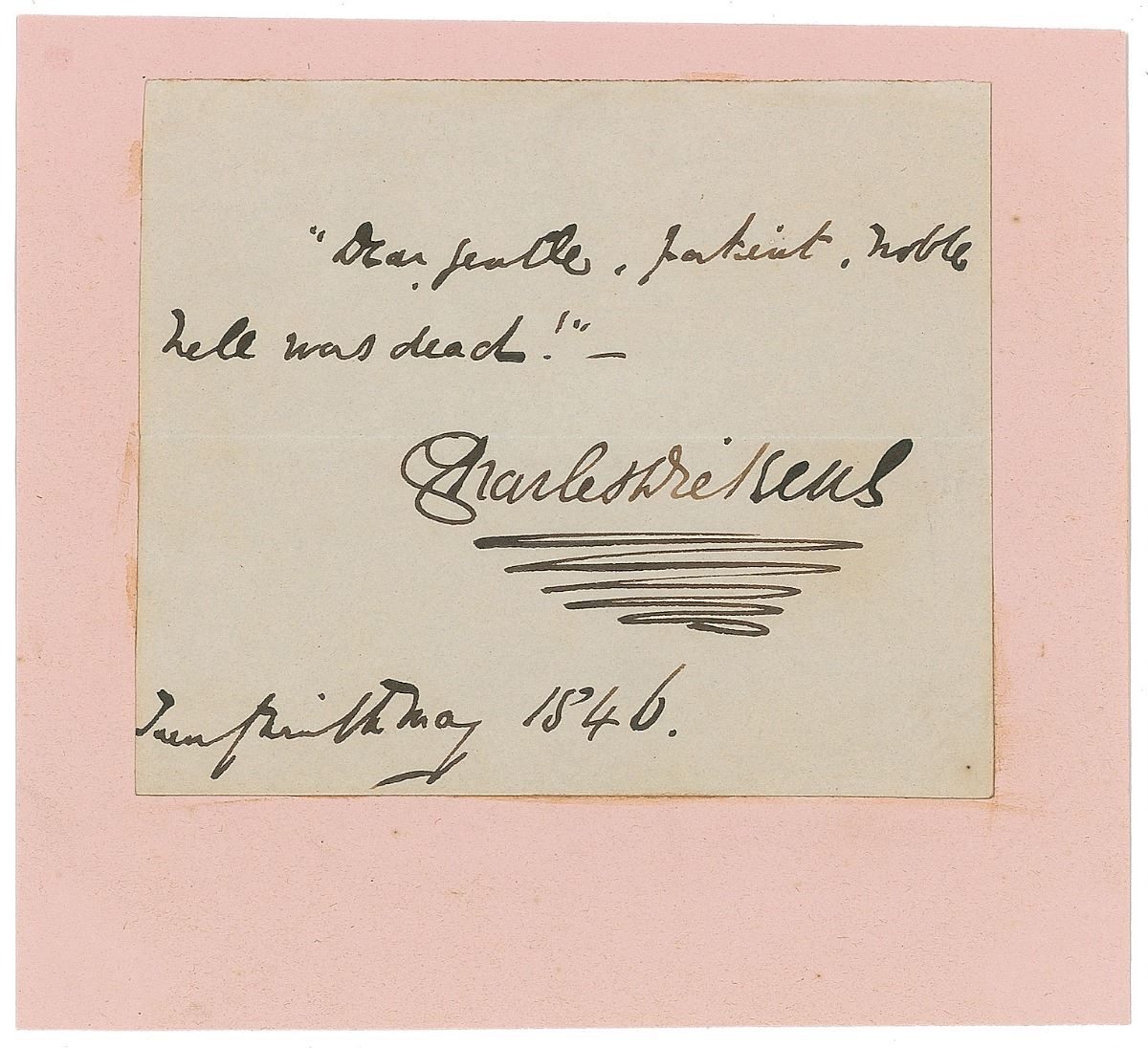 Desirable AQS on an off-white 4.25 x 3.5 sheet, prominently signed at the conclusion in ink,“Charles Dickens, Twenty ninth May 1846.” Dickens pens a brief quote from his 1841 novel The Old Curiosity Shop, in full: “Dear gentle, patient, noble Nell was dead!” Affixed to a slightly larger sheet. In fine condition. Due to the immense popularity of The Old Curiosity Shop upon its initial serialization, Little Nell, an angelic 14-year-old girl protecting her mentally infirm grandfather during a perilous journey into the countryside, became a beloved character within the Victorian reading public. Nell’s readership stretched across the Atlantic, as well, with crowds of Americans anxiously waiting at ports for English ships, eager to learn of the whereabouts and well-being of the young orphan. The anticipation for the last installment of the serial was unparalleled, and Nell’s tragic end provoked emotional reactions from Dickens’s international fanbase.