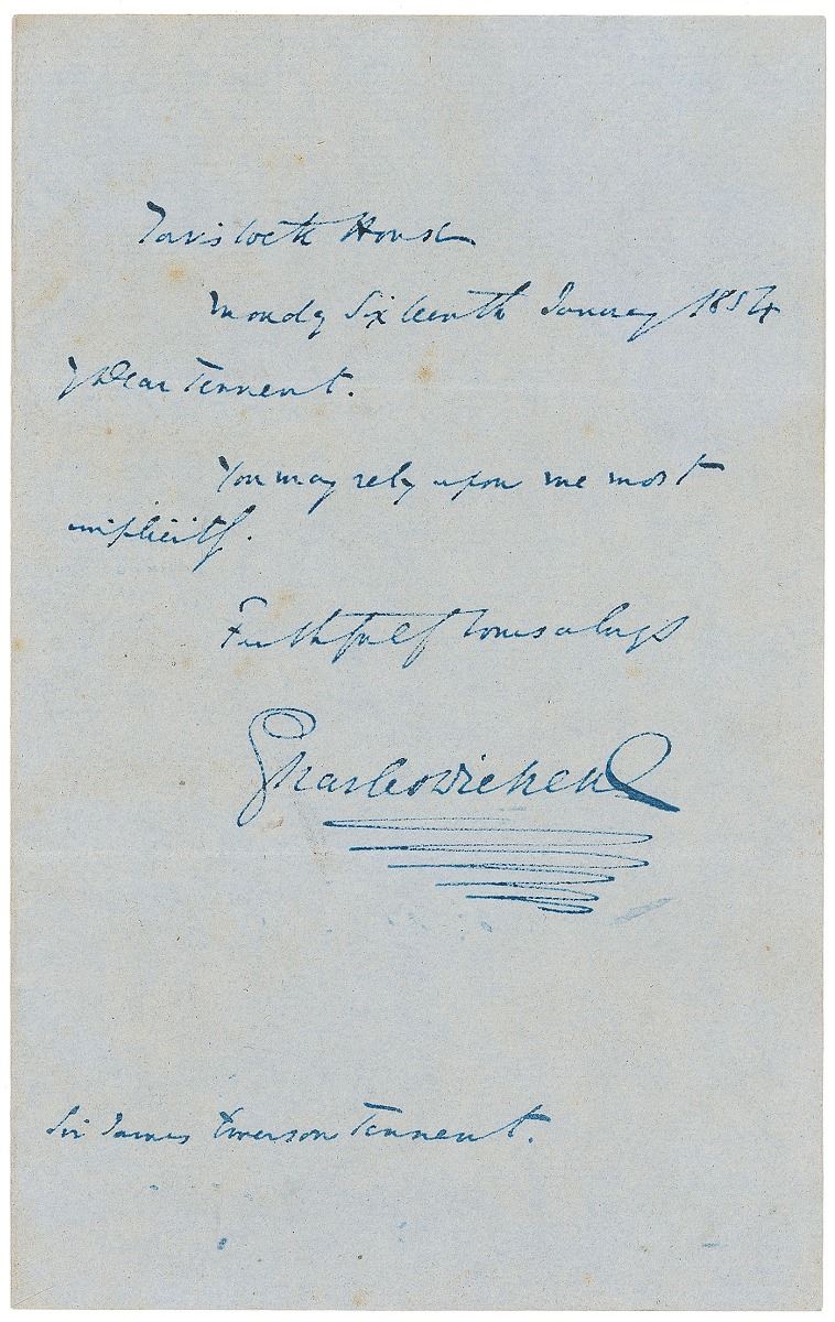 ALS, one page, 4.25 x 7, Tavistock House, January 6, 1854. Brief letter to Sir James Emerson Tennent, in full: “You may rely on me most implicitly.” In fine condition, with a few spots of scattered light toning. Tennent was a friend of both Charles Dickens and Dickens's biographer John Forster, and was the dedicatee of Dickens's last completed novel, Our Mutual Friend.