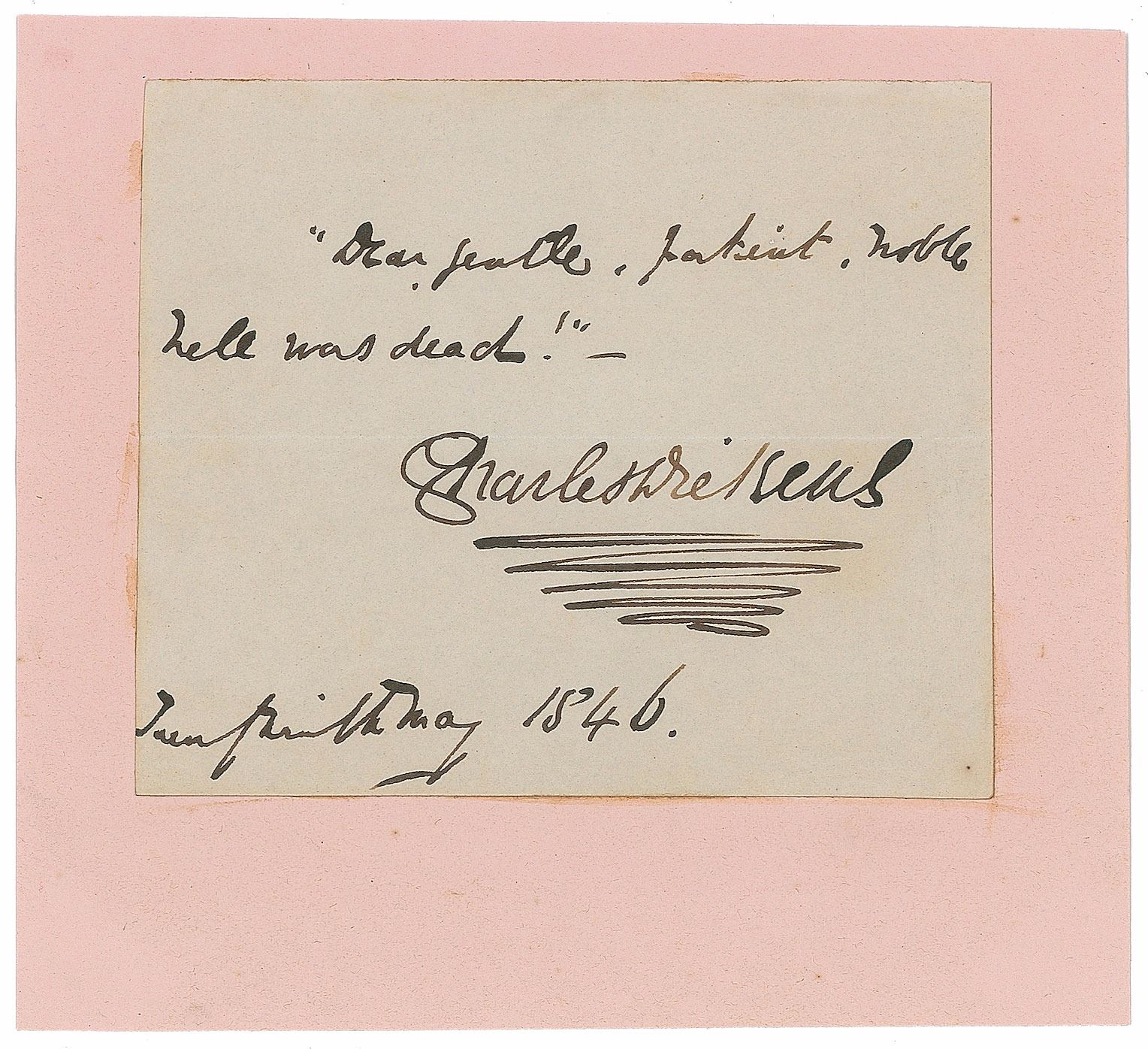 Desirable AQS on an off-white 4.25 x 3.5 sheet, prominently signed at the conclusion in ink,“Charles Dickens, Twenty ninth May 1846.” Dickens pens a brief quote from his 1841 novel The Old Curiosity Shop, in full: “Dear gentle, patient, noble Nell was dead!” Affixed to a slightly larger sheet. In fine condition. Due to the immense popularity of The Old Curiosity Shop upon its initial serialization, Little Nell, an angelic 14-year-old girl protecting her mentally infirm grandfather during a perilous journey into the countryside, became a beloved character within the Victorian reading public. Nell’s readership stretched across the Atlantic, as well, with crowds of Americans anxiously waiting at ports for English ships, eager to learn of the whereabouts and well-being of the young orphan. The anticipation for the last installment of the serial was unparalleled, and Nell’s tragic end provoked emotional reactions from Dickens’s international fanbase.