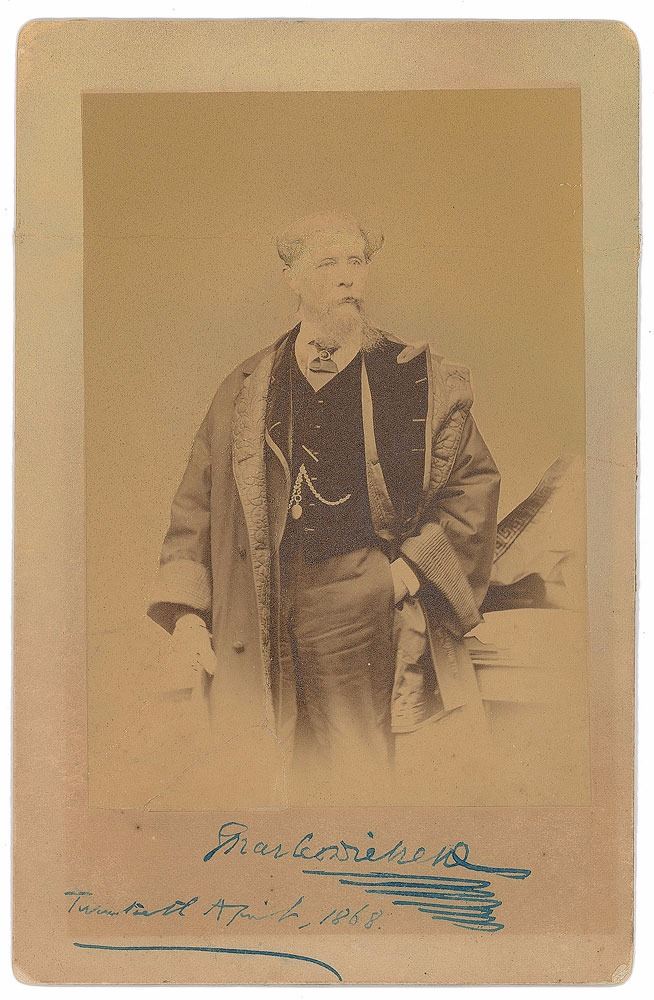 Dickens made his second trip to America in 1867-1868, touring the country and giving public readings along the way, where he was delighted and impressed at the reception given him. On the day he signed this, Dickens performed his last-ever reading in America at Steinway Hall in New York. Upon finishing, the author was hailed with thunderous applause and he gave a brief summation of his thoughts on his time in the United States, saying, 'I shall never recall you as a mere public audience, but rather as a host of personal friends, and ever with the greatest gratitude, tenderness and consideration. Ladies and gentlemen, I beg to bid you farewell. God bless you, and God bless the land in which I leave you.' With that, he left for England out of the port of New York on the following day, never to return. A fantastic image—his manager called it 'the only good photograph of him in existence'—signed on an important date, this is a scarce photo, larger than typically seen, that marks the conclusion of Dickens's journey across the Atlantic.