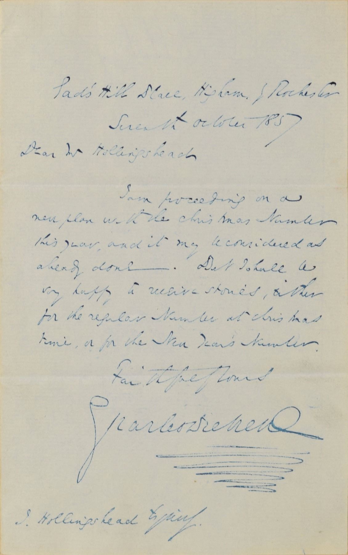 ALS, one page, 4.5 x 7, October 7, 1857. Letter to journalist and writer John Hollingshead, in full: "I am proceeding on a new plan with the Christmas Number this year, and it may be considered as already done. But I shall be very happy to write stories, either for the regular Number at Christmas time, or for the New Year's Number." Beautifully triple-matted and framed with an etching behind UV-protective acrylic to an overall size of 17.5 x 14. Affixed to a larger sheet and in fine condition. Hollingshead started his journalism career in 1854 under the tutelage of Charles Dickens at the magazine Household Words, and then under W. M. Thackeray at Cornhill Magazine. Dickens had published his iconic tale, A Christmas Carol, through Chapman and Hall in 1843. An excellent, writing-related letter by the esteemed British scribe.