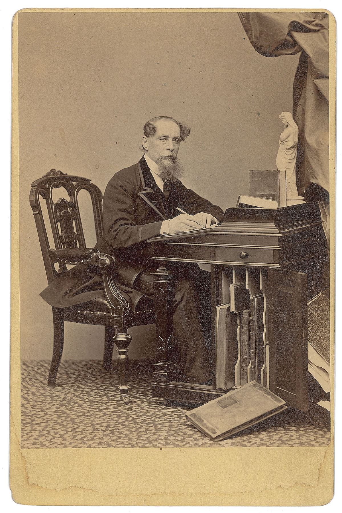 Original 4.25 x 6.5 cabinet portrait of Dickens in a full-length pose, showing the adored scribe seated at his desk with pen in hand, unsigned and published by Gurney of New York during his second tour of the United States in 1867. In fine condition, with light staining to the lower border.