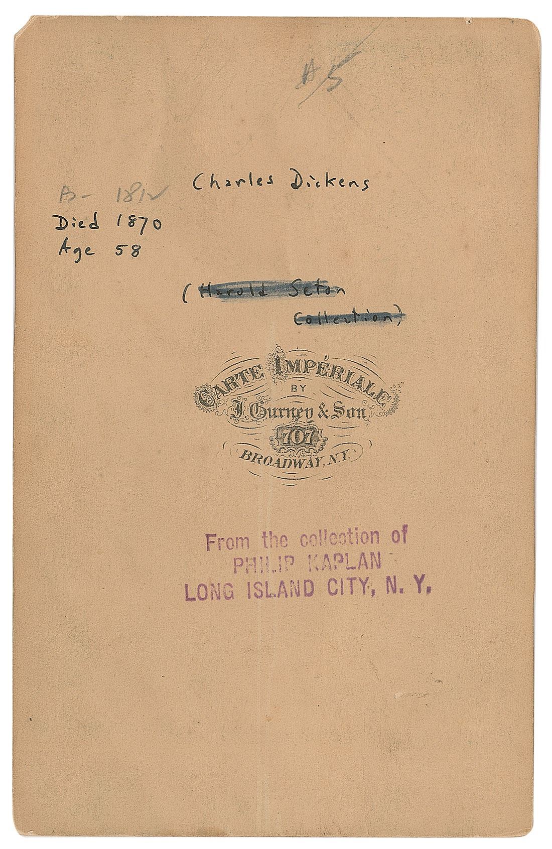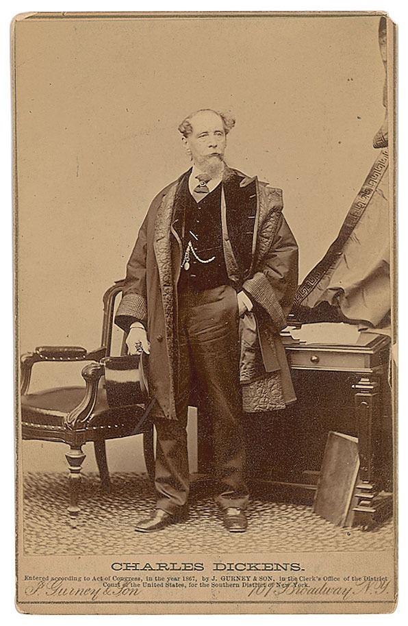 Very appealing 4 x 6.5 cabinet portrait of Charles Dickens in a full-length pose, showing the adored scribe standing at his desk and holding a top hat, flanked by a chair and desk with books and scattered sheets. Unsigned and published by J. Gurney & Son of New York during Dickens's second tour of the United States in 1867. Reverse bears collector's notations and an ownership stamp. In fine condition, with light silvering to the darker areas of the images, and light wear to the corner tips.