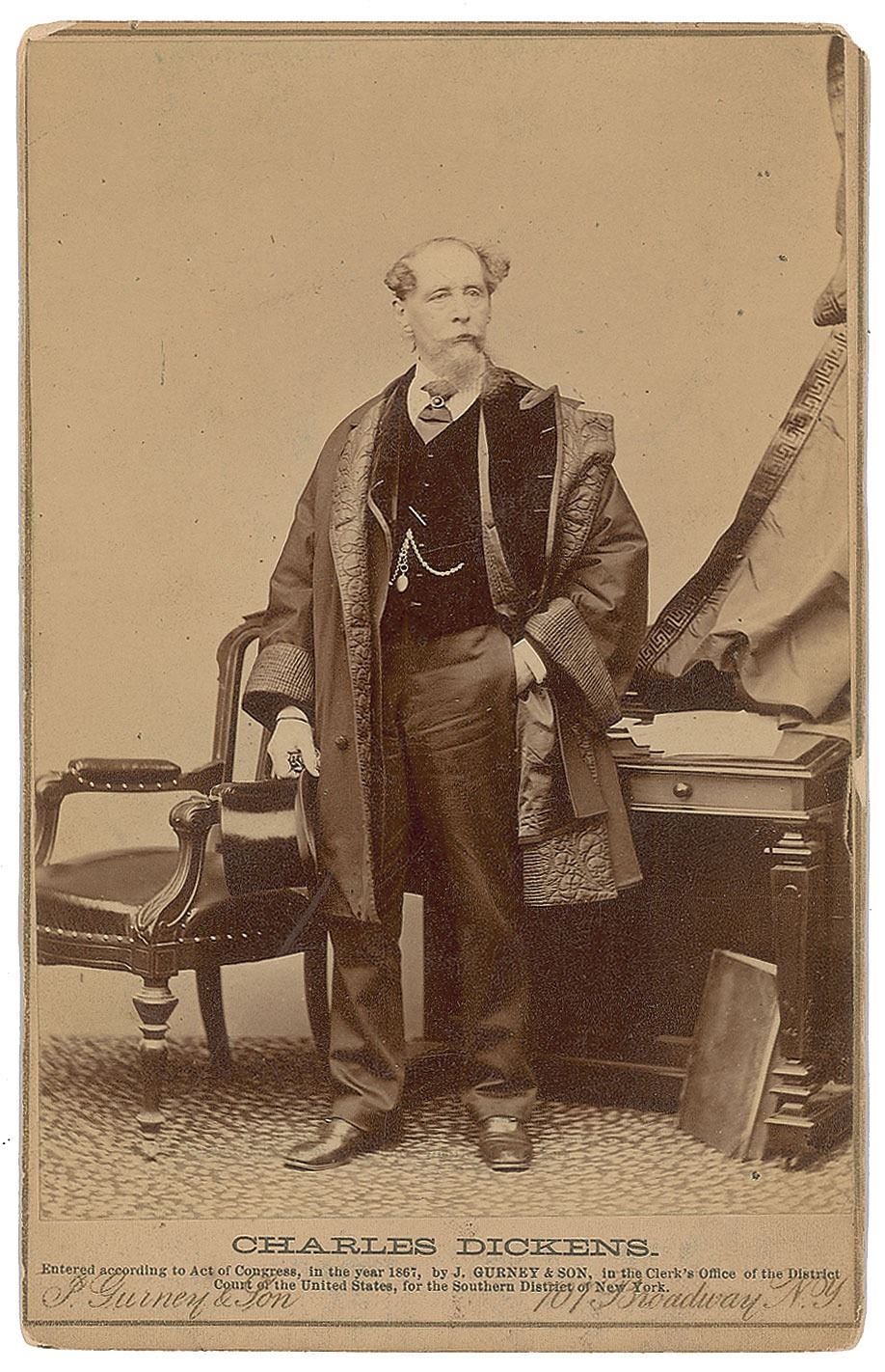 Desirable 4 x 6.5 cabinet photo of Charles Dickens in a regal full-length pose, taken in 1867 by J. Gurney & Son of New York during the author's second American tour. Reverse is marked "Carte Impériale by J. Gurney & Son, 707 Broadway, New York." In fine condition, with trimmed edges, light silvering to the darker areas of the image, and ink notations and a collector's stamp to the reverse. After an initial 1842 visit to the USA, Dickens returned in December 1867 for a second tour. Shuttling between Boston and New York, he conducted over 70 readings of his works and netted approximately £19,000 in royalties.