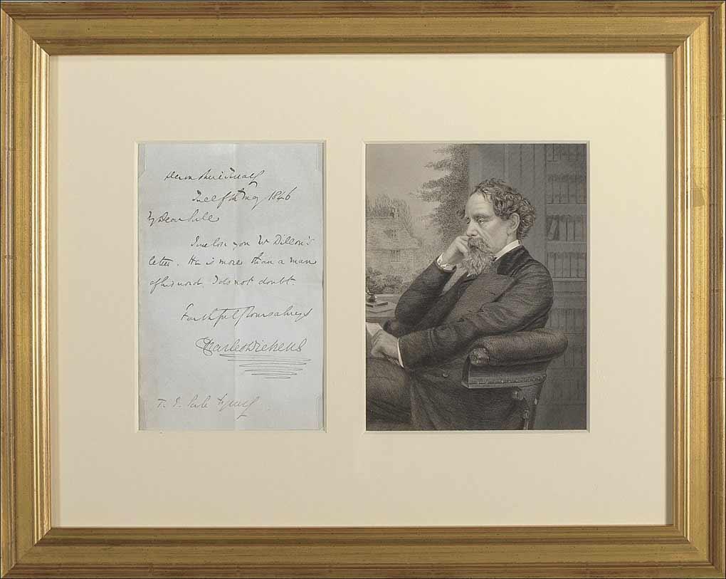 ALS, one page, 4.25 x 6.5, May 12, 1846. Short letter to T. J. Serle. In full: “I enclose you Mr. Dillon’s letter. He is more than a man of his word, I do not doubt. Faithfully Yours, always, Charles Dickens.” Matted and framed with a half-length seated engraved portrait, to an overall size of 16.5 x 13.5. In fine condition, with intersecting mailing folds, one through a single letter of signature.