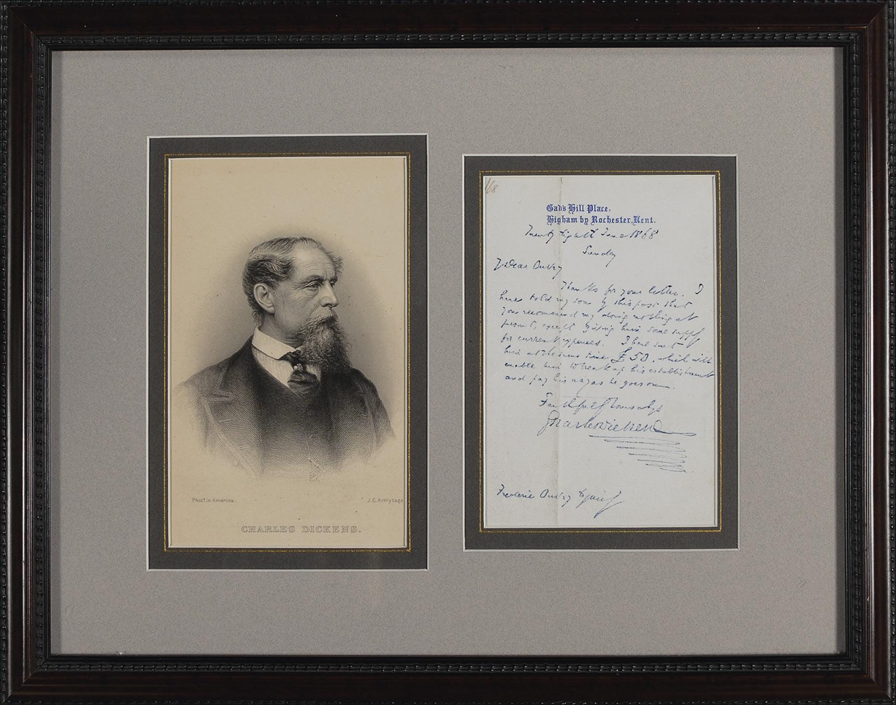 ALS, one page, 4.25 x 6.5, Gad’s Hill Place letterhead, June 28, 1868. Letter to his lawyer. In full: “Thanks for your letter. I have told my son by this post that you recommend my doing nothing at present, except giving him some supply for current expenses. I had sent him at the same time £50 which will enable him to break up his establishment and pay his way as he goes on.” Double matted and framed with an engraved portrait of Dickens, to an overall size of 16.75 x 13.25. Intersecting folds (heavier vertical fold through single letter of signature), a bit of trivial soiling along the same fold, and small ink notation to top left corner, otherwise fine condition.