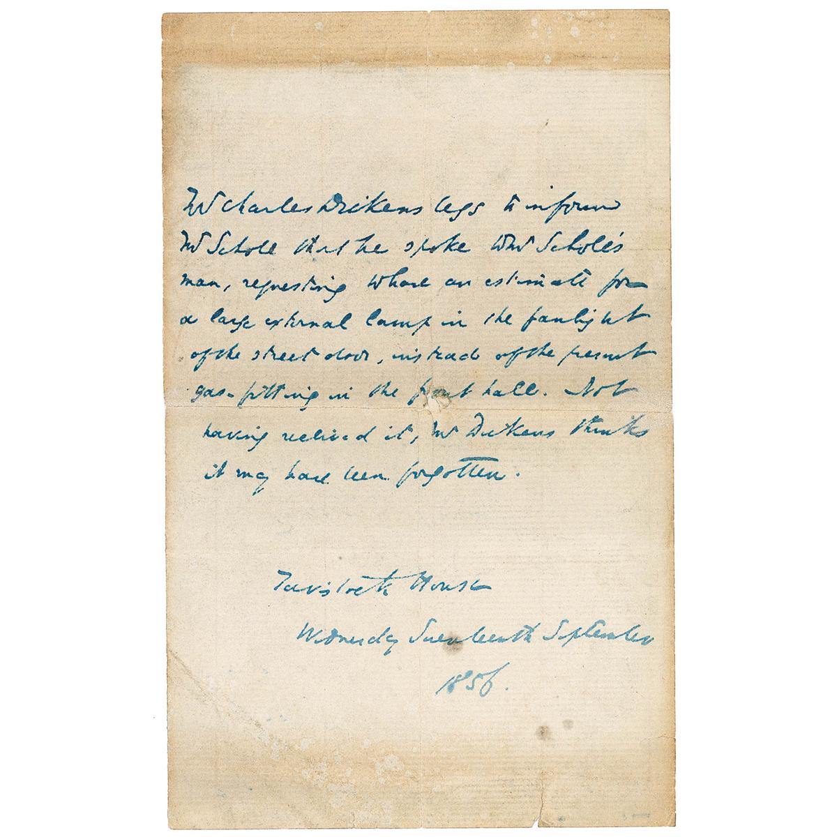 Twice signed third-person ALS, one page, 4.5 x 7, September 17, 1856. In full, “Mr Charles Dickens begs to inform Mr Scholl that he spoke to Mr Scholl’s man, requesting to have an estimate for a large external lamp in the fanlight of the street door, instead of the present gas-fitting in the front hall. Not having received it, Mr Dickens thinks it may have been forgotten.” Intersecting folds, small hole at junction of folds at center, scattered soiling, toning to edges and central horizontal fold, and tape reinforcement to reverse of folds, otherwise very good condition.