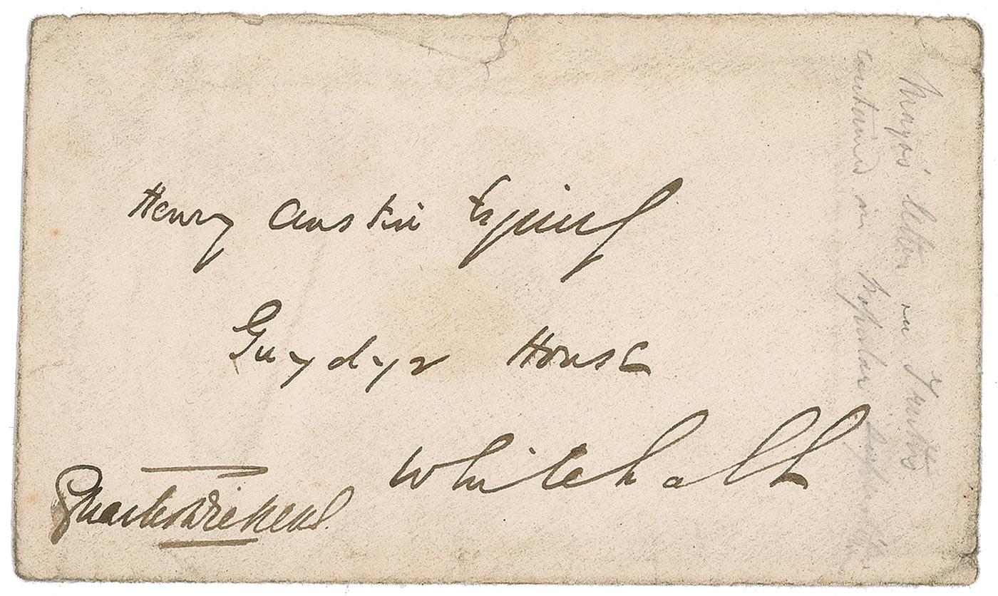 Hand-addressed and signed mailing envelope, 5 x 3, addressed to “Henry Austin, Esquire, Guydyz House, Whitehall,” and signed in the lower left corner, “Charles Dickens.” In very good condition, with scattered toning and soiling, a few creases and wrinkles, pencil notations to right side, and a couple small edge tears.