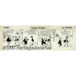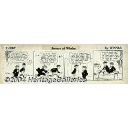 Charles "Doc" Winner - Original Comic Strip Art for Tubby, Group of Three Dailies (United Features Syndicate, ca. 1923). One of United Features Syndicate's best all-around artists, "Doc" Winner had a hand in many of that distributor's most popular strips, including Thimble Theater, Barney Google, and The Katzenjammer Kids. The Tubby strips offered here are from a much earlier period, showing the development of an impressive talent. Dated "Feb. 1," "Feb. 4," and "Aug. 30" in the left margins, only one strip displays a copyright date of 1923. In excellent condition and measuring approximately 20.75" x 7" overall, each strip is signed "Winner" in the last panel. Important notice: Heritage usually auctions material at the rate of 200-250 lots per hour. On some occasions eBay Live bid software or the Internet may not be able to keep up with the pace of the auction. We recommend placing a realistic absentee bid now as insurance to avoid disappointment. Occasionally the auctioneer may eliminate or reject an eBay Live bid, and the auctioneer may also reopen a lot after the close of the eBay live bidding (usually because we missed an audience bid), and may reject your bid even if it shows you as the winning bidder. By bidding via eBay Live, you agree that Heritage may award the lot to another bidder at its sole discretion under the circumstances described above or any other reasonable circumstances. Since eBay bids are not shown to us until we open the lot on the floor, we treat those bids just like floor bids. In most cases the floor responds before the eBay bid is presented to us, due to Internet lag time, so for consistency we have made it a policy that floor bids are always considered first over tie eBay live bids. Also please note that all Heritage lots purchased through eBay Live carry a 20% Buyer's Premium. Please make sure you read the Terms and Conditions before you bid.