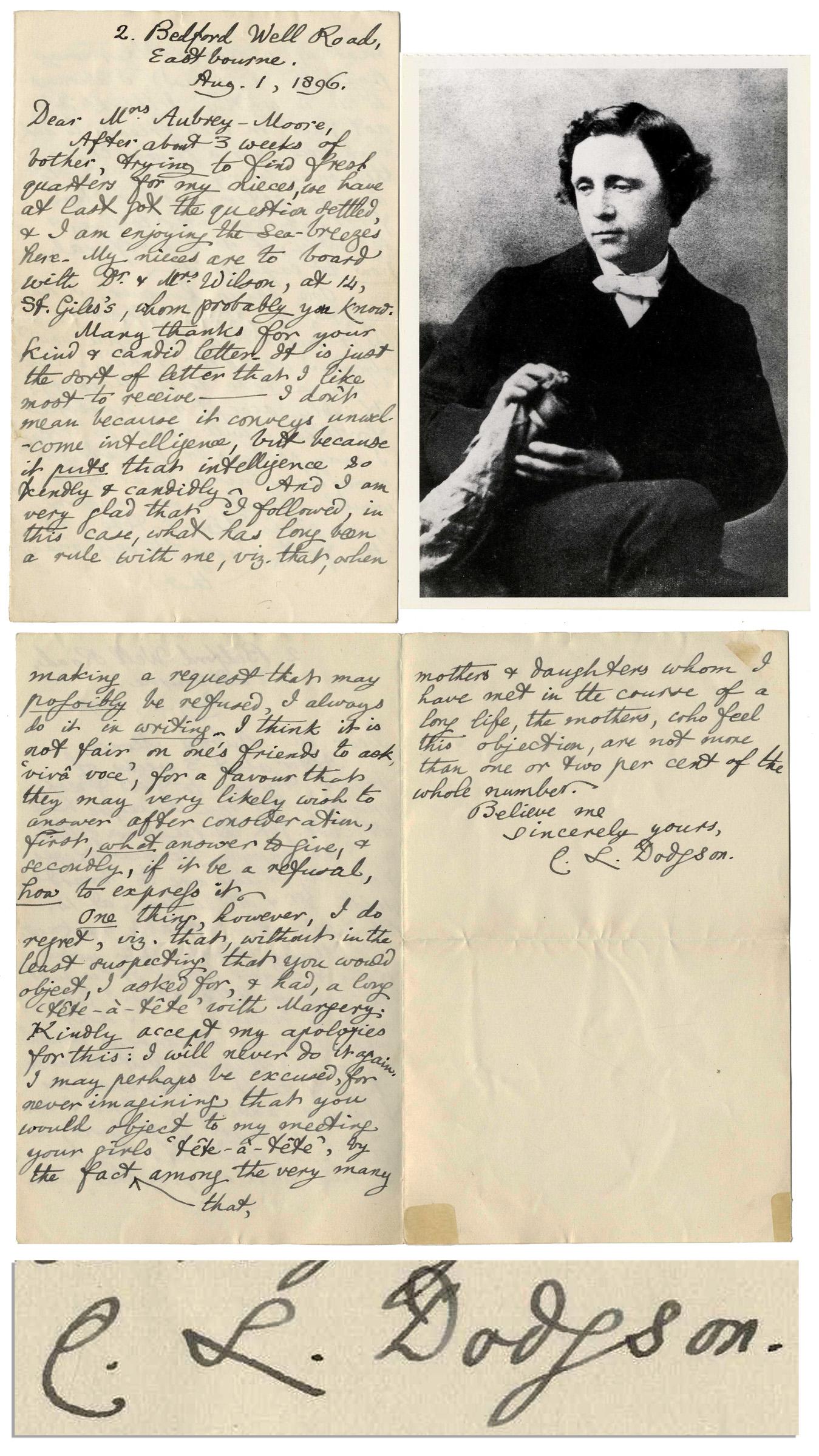 Charles Dodgson, more famously known by his pen name Lewis Carroll, autograph letter signed, dated 1 August 1896 from East Bourne, England. In a very carefully worded letter, the 64-year old author apologizes to a Mrs. Aubrey-Moore for having been caught having a ''tete-a-tete'' with his correspondent's 14-year old daughter. Reads in part: ''…Many thanks for your kind & candid letter. It is just the sort of letter that I like most to receive -- I don't mean because it conveys unwelcome intelligence, but because it puts that intelligence so kindly and candidly -- And I am very glad that I followed, in this case, what has long been a rule with me, viz. that, when making a request that may possibly be refused, I always do it in writing -- I think it is not fair, on one's friends to ask 'viva voce' for a favour that they may very likely wish to answer after consideration, first, what answer to give, & secondly, if it be a refusal, how to express it. One thing, however, I do regret, viz. that, without in the least suspecting that you would object, I asked for, & had, a long 'tete-a-tete' with Margery. Kindly accept my apologies for this: I will never do it again. I may perhaps be excused, for never imagining that you would object to my meeting your girls 'tete-a-tete', by the fact that among the very many mothers & daughters whom I have met in the course of a long life, the mothers, who feel this objection, are not more than one or two percent of the whole number. Believe me / Sincerely yours / C.L. Dodgson''. Card-style letter measures 4.5'' x 7'' on three pages with signature on page three. Includes original envelope postmarked in Dodgson's hand. Minor toning and one fold from mailing, else near fine.