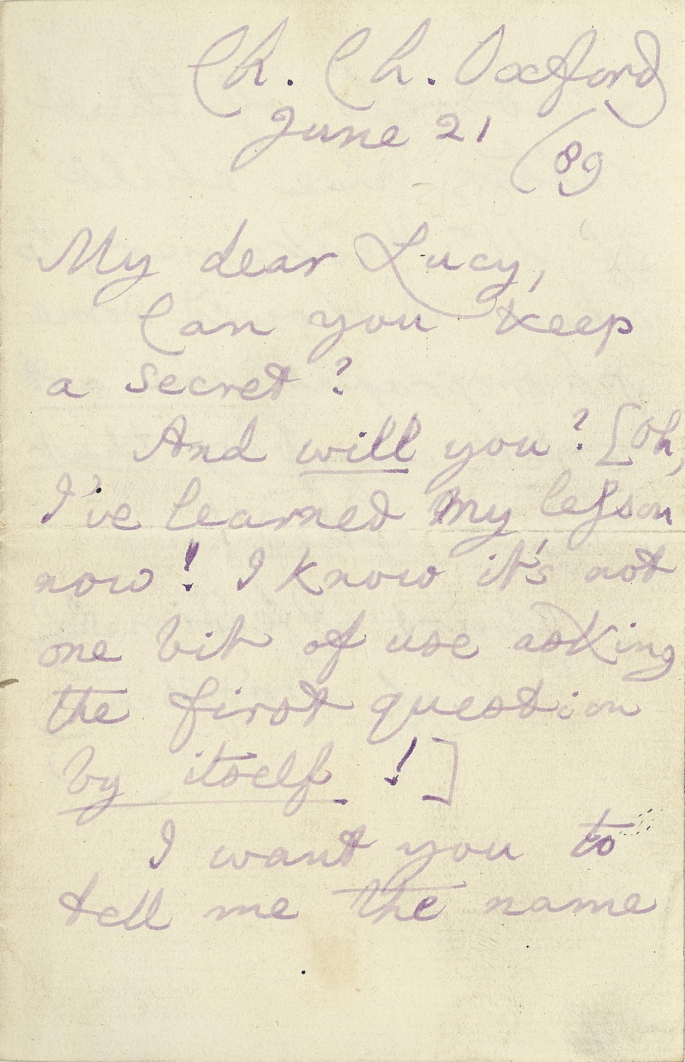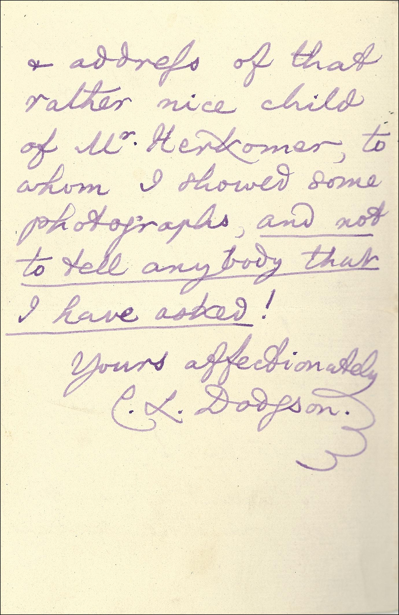 British author, mathematician, and photographer (1832–1898) who, under the pen name Lewis Carroll, published Alice’s Adventures in Wonderland and its sequel, Through the Looking-Glass, two of the most popular and durable classics in the canon of children’s literature. ALS signed “C. L. Dodgson,” one page both sides, 3.5 x 5.5, June 21, 1889. Dodgson writes to Lucy [likely his artist friend Lucy Walters]. In full: “Can you keep a secret? And will you? (Oh, I’ve learned my lesson now! I know it’s not one bit of use asking the first question by itself!) I want you to tell me the name & address of that rather nice child of Mr. Herkomer, to whom I showed some photographs, and not to tell anybody that I have asked!” In addition to his literary activities, Dodgson was an avid photographer from the early decades of the emerging art until 1880, during which time he became especially known for his portraits of such well-known artistic and literary personalities as Dante Gabriel Rossetti and Alfred Lord Tennyson, and of young female subjects, including Alice Liddell, the inspiration for his most famous series of books. “Mr. Herkomer” was evidently artist Sir Hubert von Herkomer (1849–1914), who ran an art school in Bushey, Hertfordshire, England, and who produced a well-known posthumous portrait of Dodgson. Dodgson’s diary entry for June 13 of the same year notes that “Lucy Walters had sent me a ticket for the ‘Herkomer’ play [an amateur stage production] at Bushey.” Ink on first page a subtle shade lighter than remainder, and a hint of mild handling wear, otherwise fine, bright condition. A wonderful window into Dodgson’s child-like sense of fun. Pre-certified John Reznikoff/PSA/DNA and RRAuction COA.
