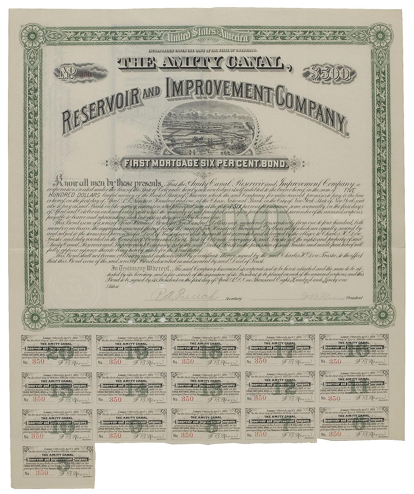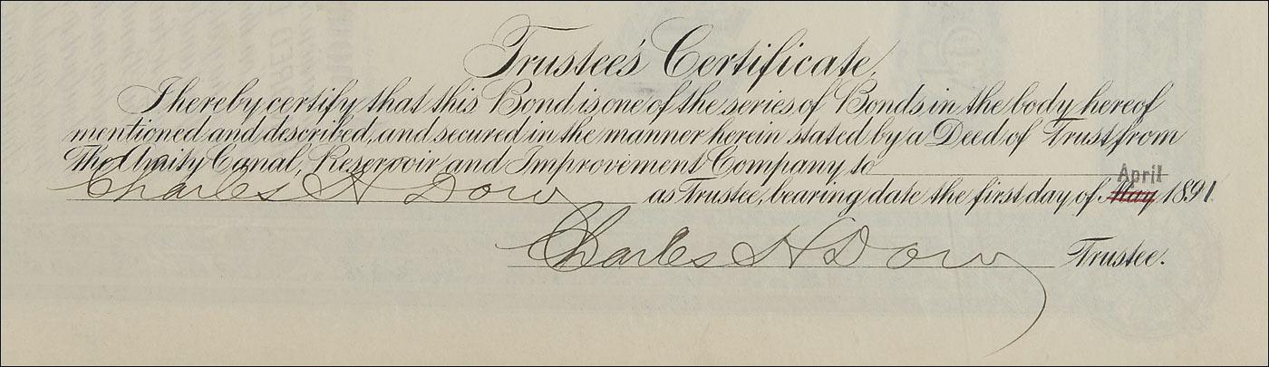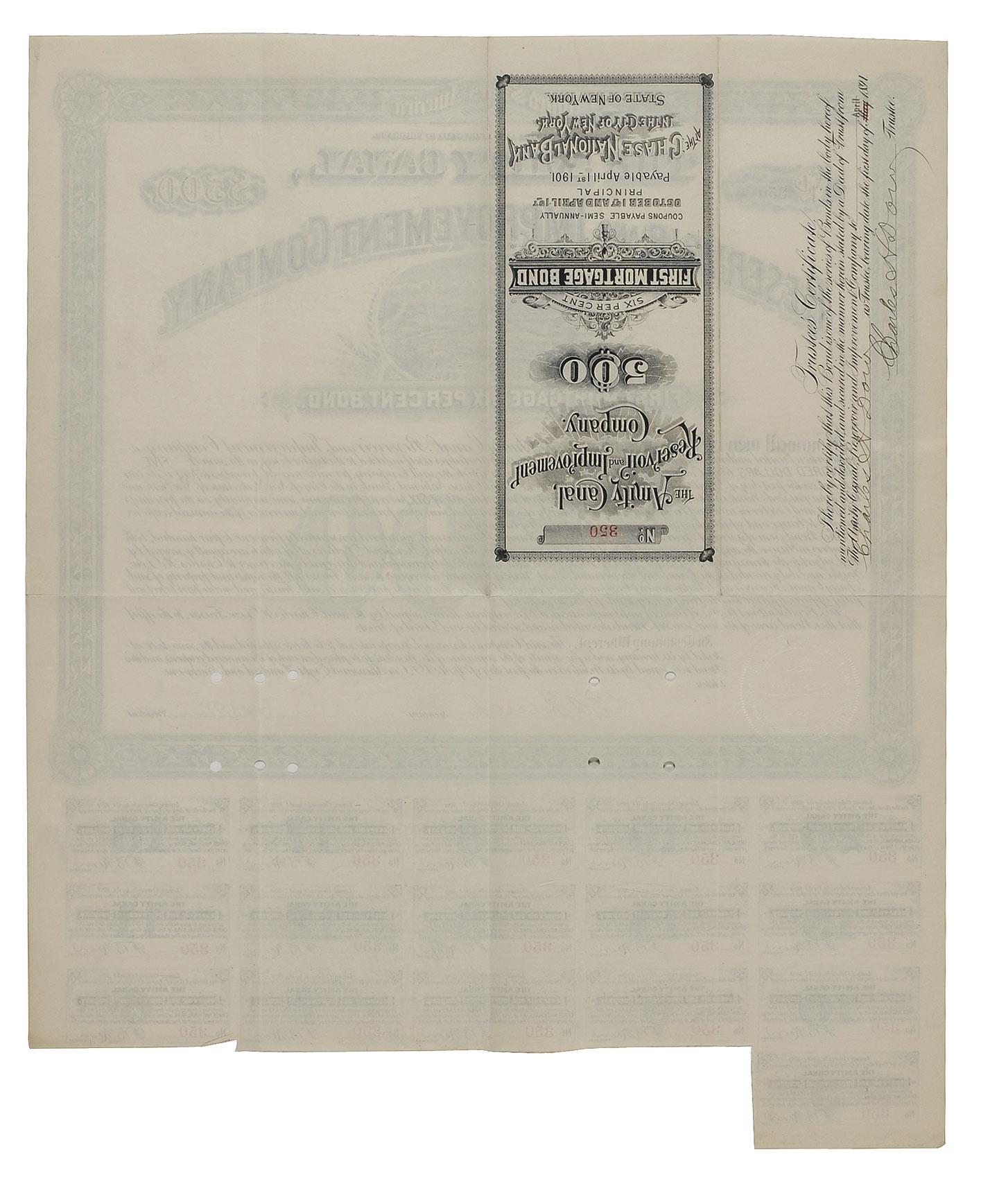 American journalist (1851–1902) who cofounded Dow Jones & Company, created the Wall Street Journal, and conceived the influential Dow Jones Industrial Average. Engraved DS, one page, 14 x 15.25, April 1, 1891. A first mortgage bond for the Amity Canal, Reservoir, and Improvement Company, signed twice by Dow as trustee on the reverse. The document retains 16 of its 20 coupons in the lower margin. Intersecting folds, irregular bottom edge from clipped coupons, and punch cancellations, no faults near the signatures, otherwise fine, fresh condition. Pre-certified PSA/DNA and RRAuction COA.
