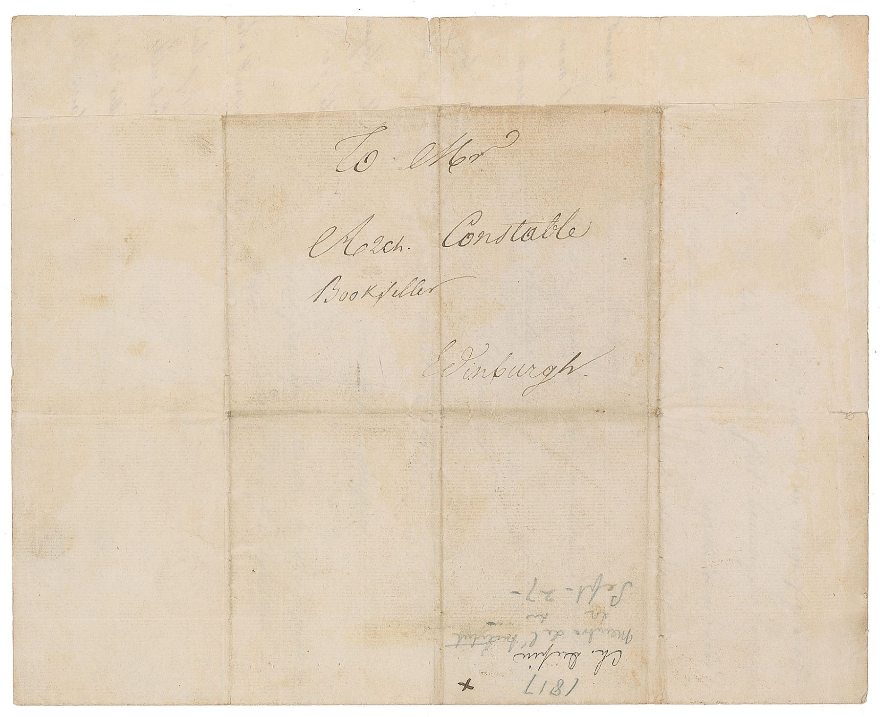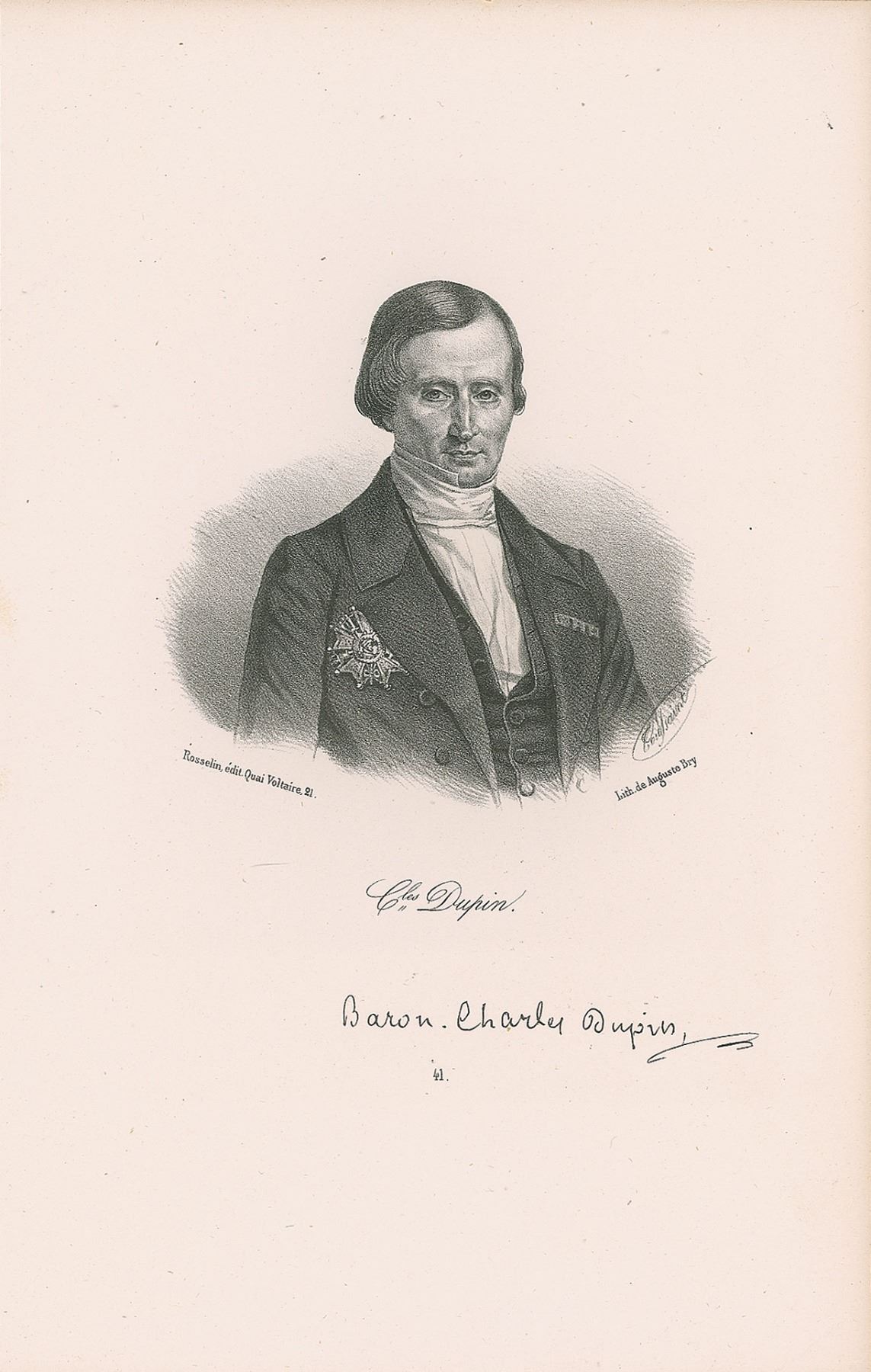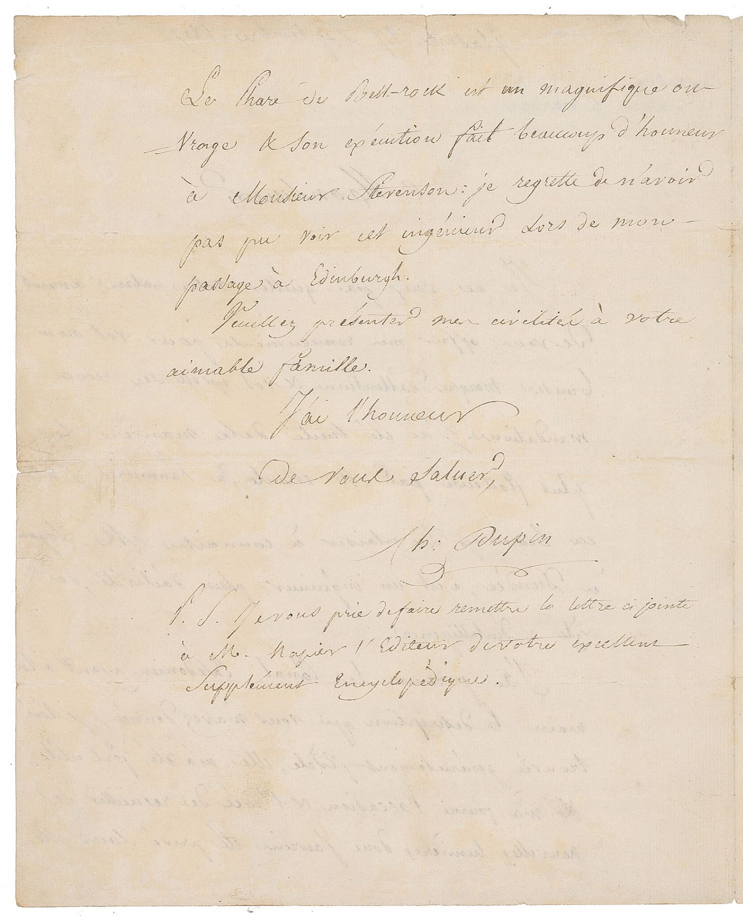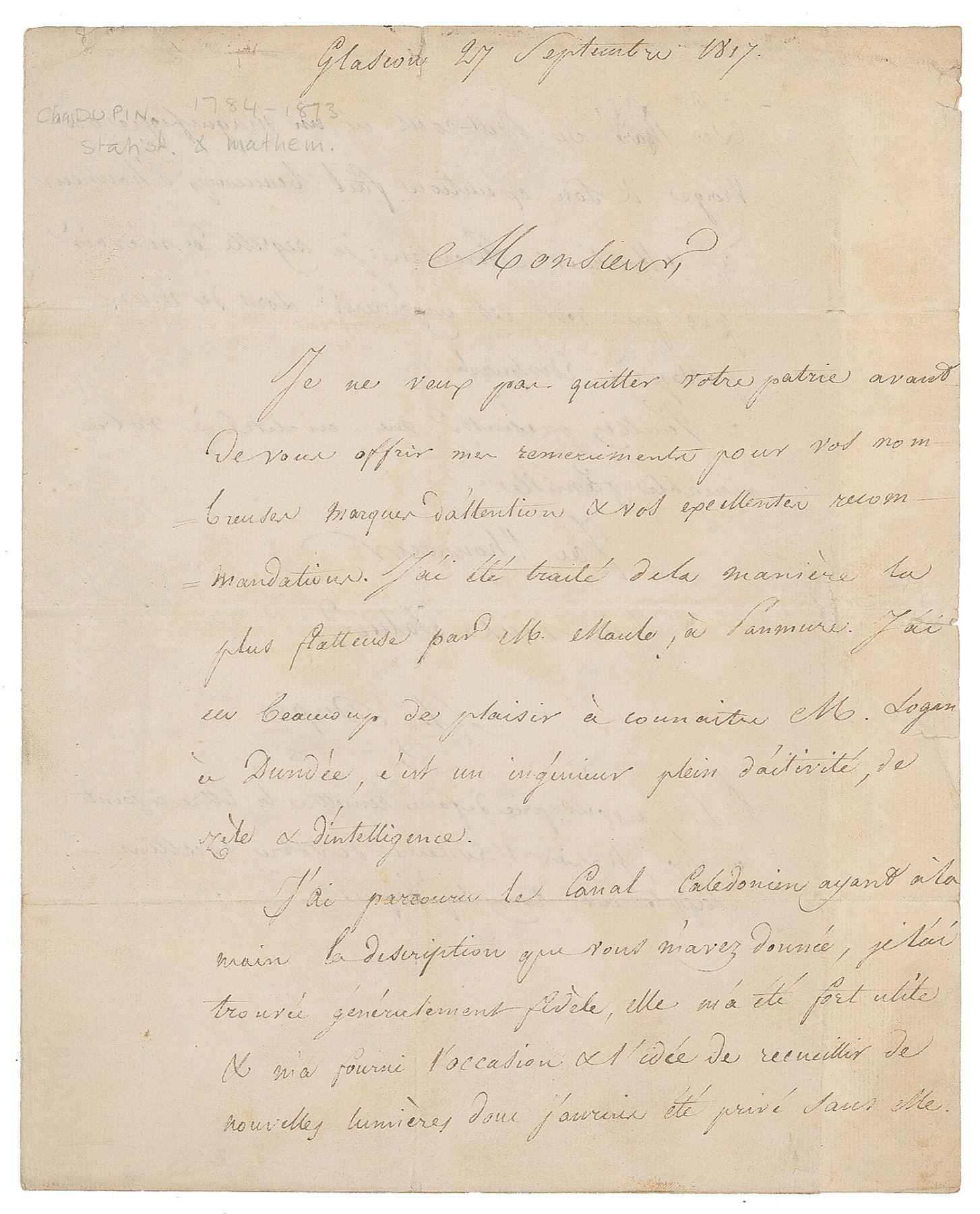 ALS in French, signed “Ch. Dupin,” one page both sides, 8 x 10, September 27, 1817. Written from Glasgow, a letter to Archibald Constable, a bookseller in Edinburgh, thanking him for his kindness and the introductions to engineers, and for his description of the Caledonian Canal, mentioning also the new lights and works which are much to the credit of "Monsieur Stevenson" [George Stephenson]. In very good to fine condition, with creasing, intersecting folds, and trimming to the integral address leaf. Accompanied by an engraved portrait bearing a facsimile signature.