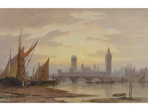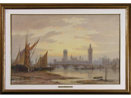 [British, RBA 1863-1955] WESTMINSTER, LONDON Watercolour on paper 17 x 27 ins. -Signed & titled -together with- OUT WITH THE MORNING TIDE, MERAGISY, CORNWALL Watercolour on paper 17 x 27 ins. -Signed & titled LOT OF TWO