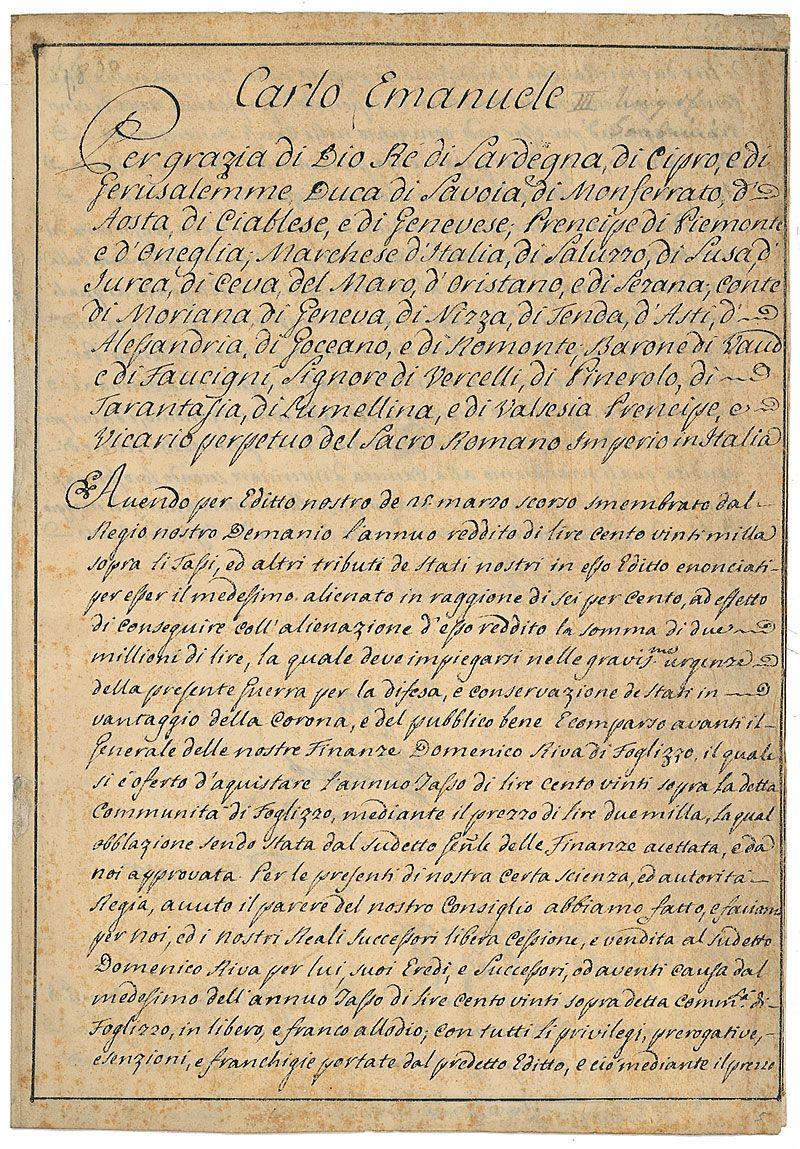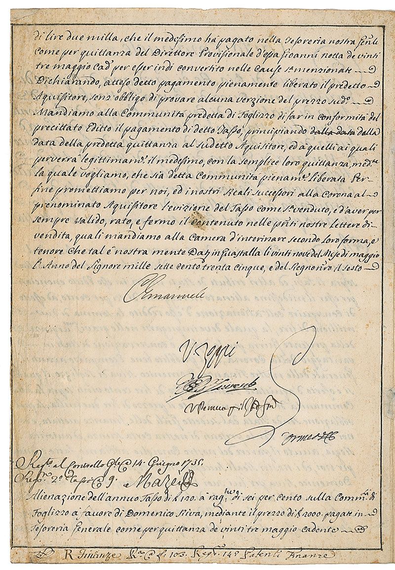 Duke of Savoy and King of Sardinia from 1730 until his death (1701–1773). Partly-printed vellum DS, in Italian, signed “C. Emanuele,” one page both sides, 8.5 x 12.25, May 29, 1735. Untranslated document in Italian. In very good condition, with overall foxing and soiling.