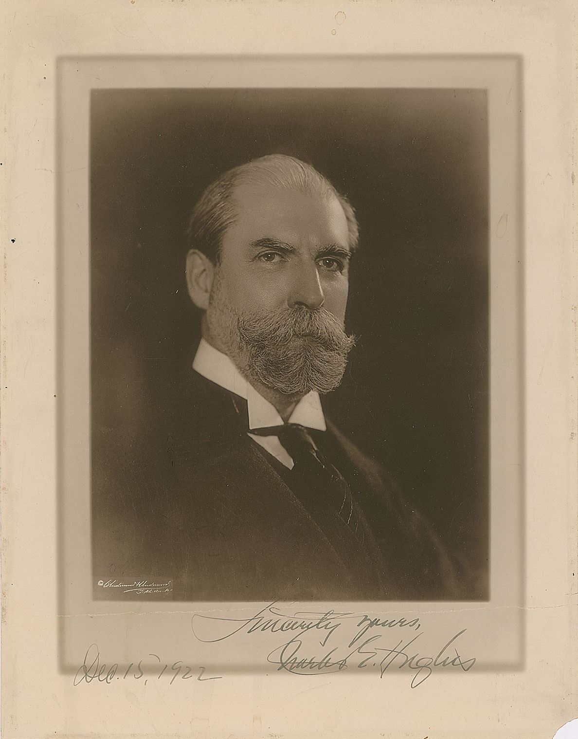 Vintage matte-finish 10.5 x 13.5 portrait of Hughes by Underwood & Underwood, signed in the lower border in fountain pen, "Sincerely yours, Charles E. Hughes, Dec. 15, 1922." In very good to fine condition, with a missing lower right corner tip, and a horizontal crease passing through the top of the sentiment.