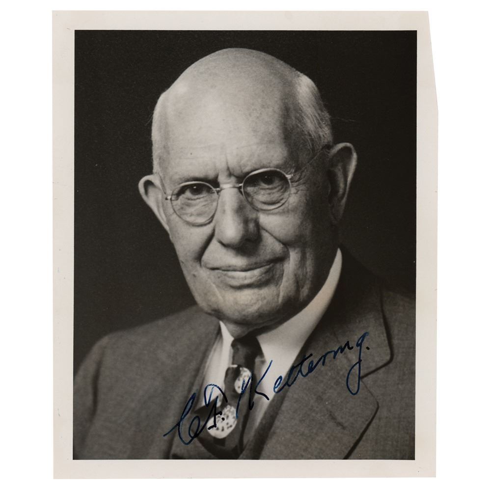 Versatile inventor (1876–1958) and longtime head of research at General Motors. Glossy 4 x 5 head-and-shoulders photo of Kettering, signed in fountain pen, "C. F. Kettering." In fine condition, with minor loss to the upper right edge.