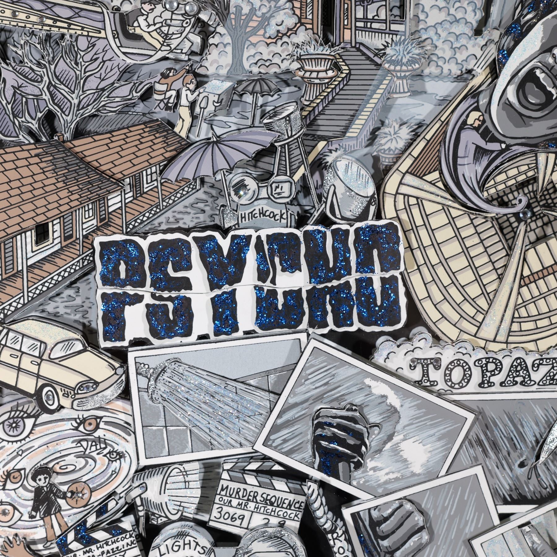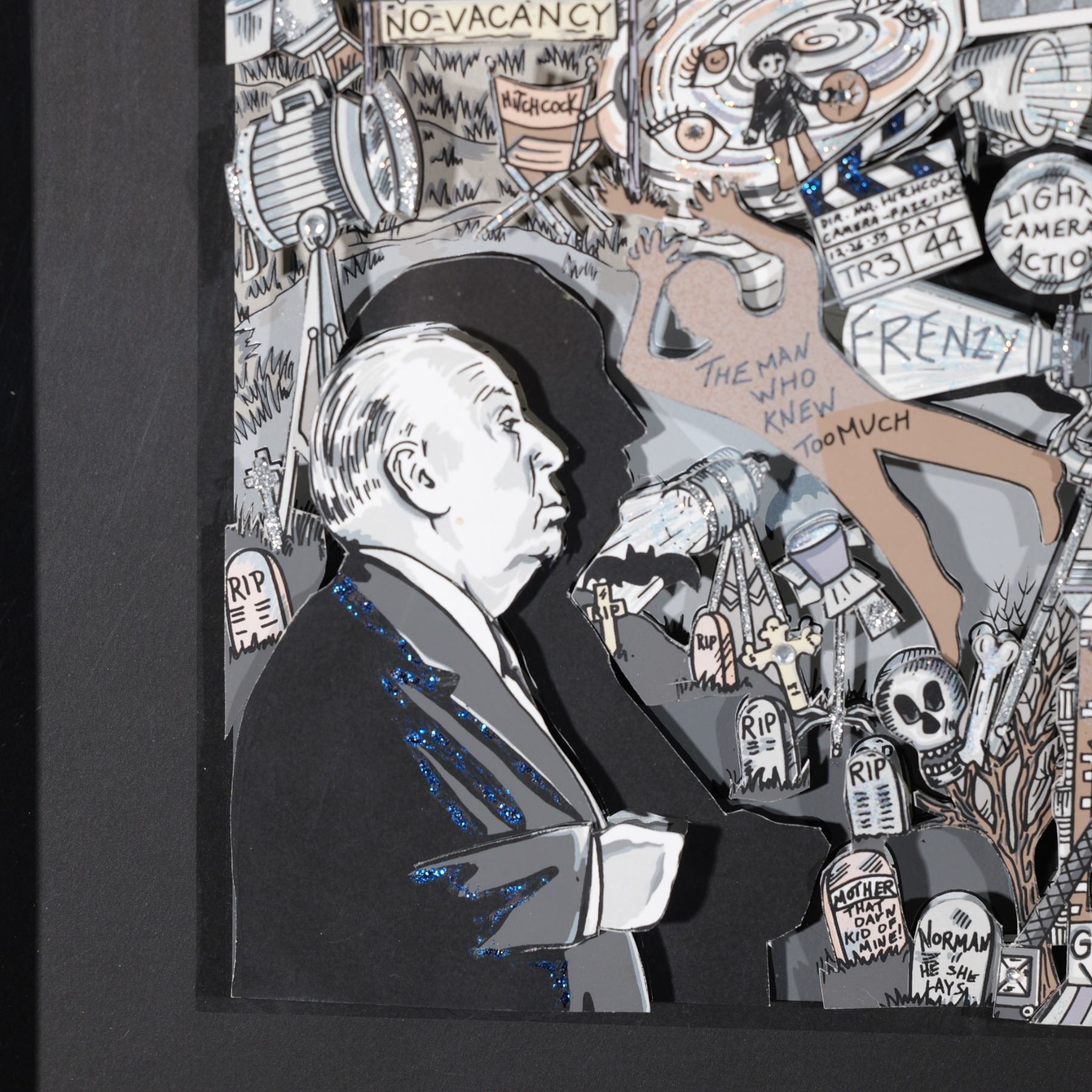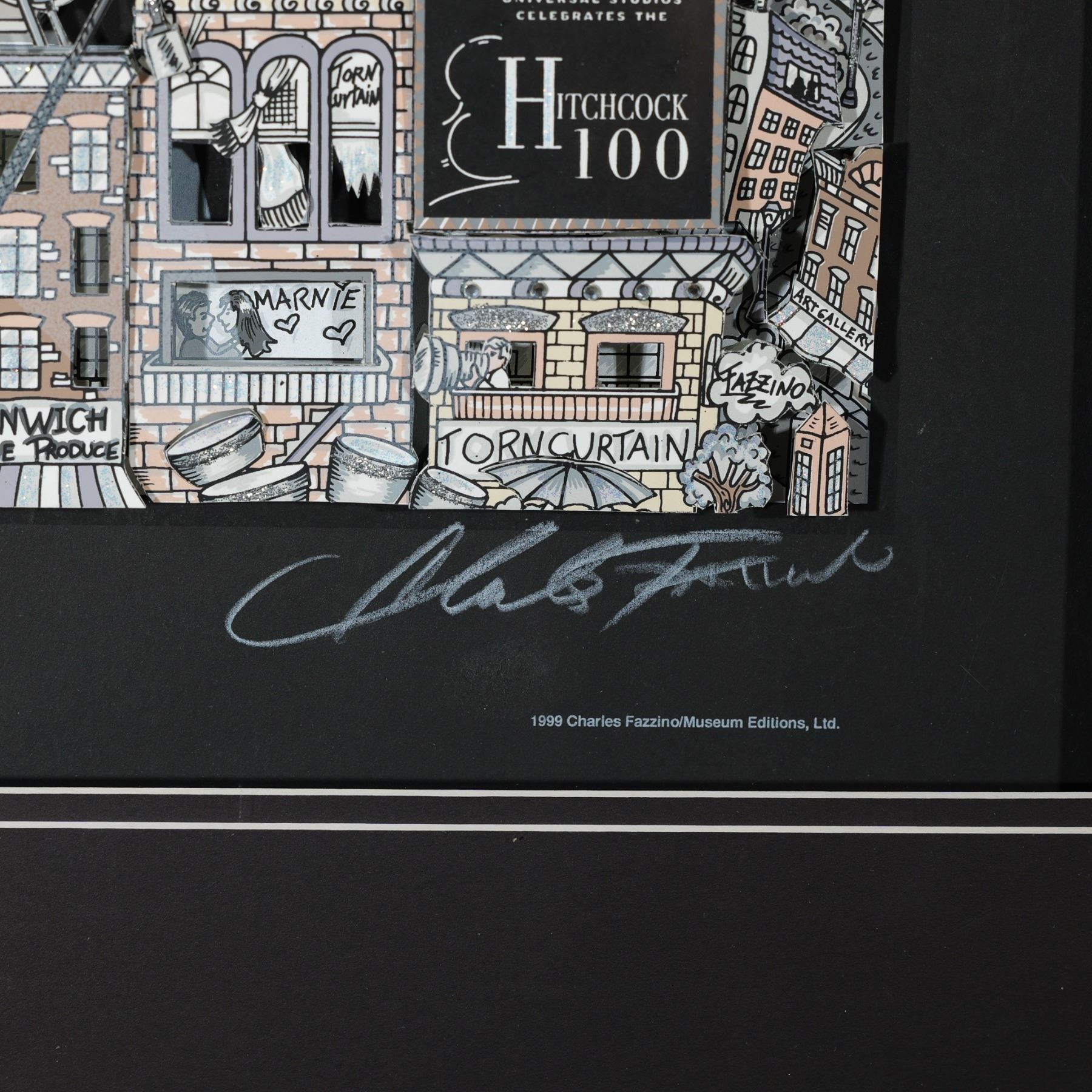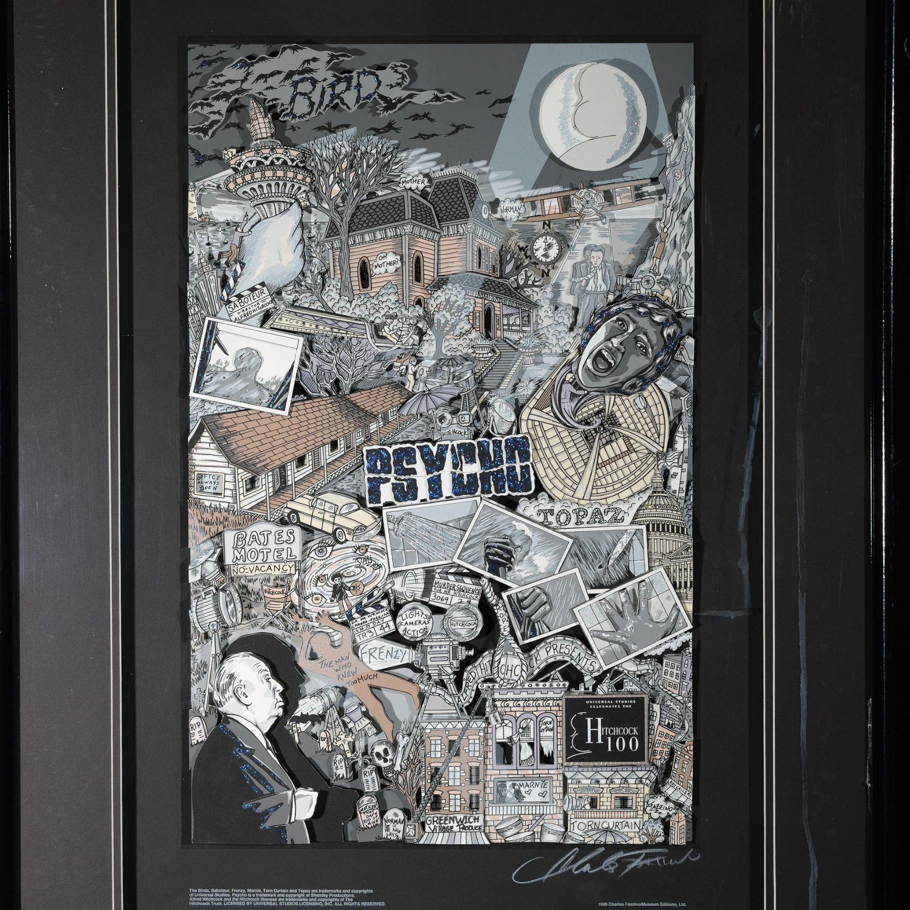Awesome 100 years commemorative 3-dimensional mixed media artwork by Pop artist Charles Fazzino created for Alfred Hitchcock's 100 years at Universal Studio. Features Hitchcock Psycho, The Birds, Vertigo and other of his cult movies that Fazzino made with cutouts enhanced with glitter. Purchased directly from Fazzino in his studio in New York. Signature on lower right: Charles Fazzino. Framed in a black shadowbox. Approximate artwork dimensions: 13"L x 1"W x 20"H. Frame size: 24.50"L x 32.25"H x 1.50"W.