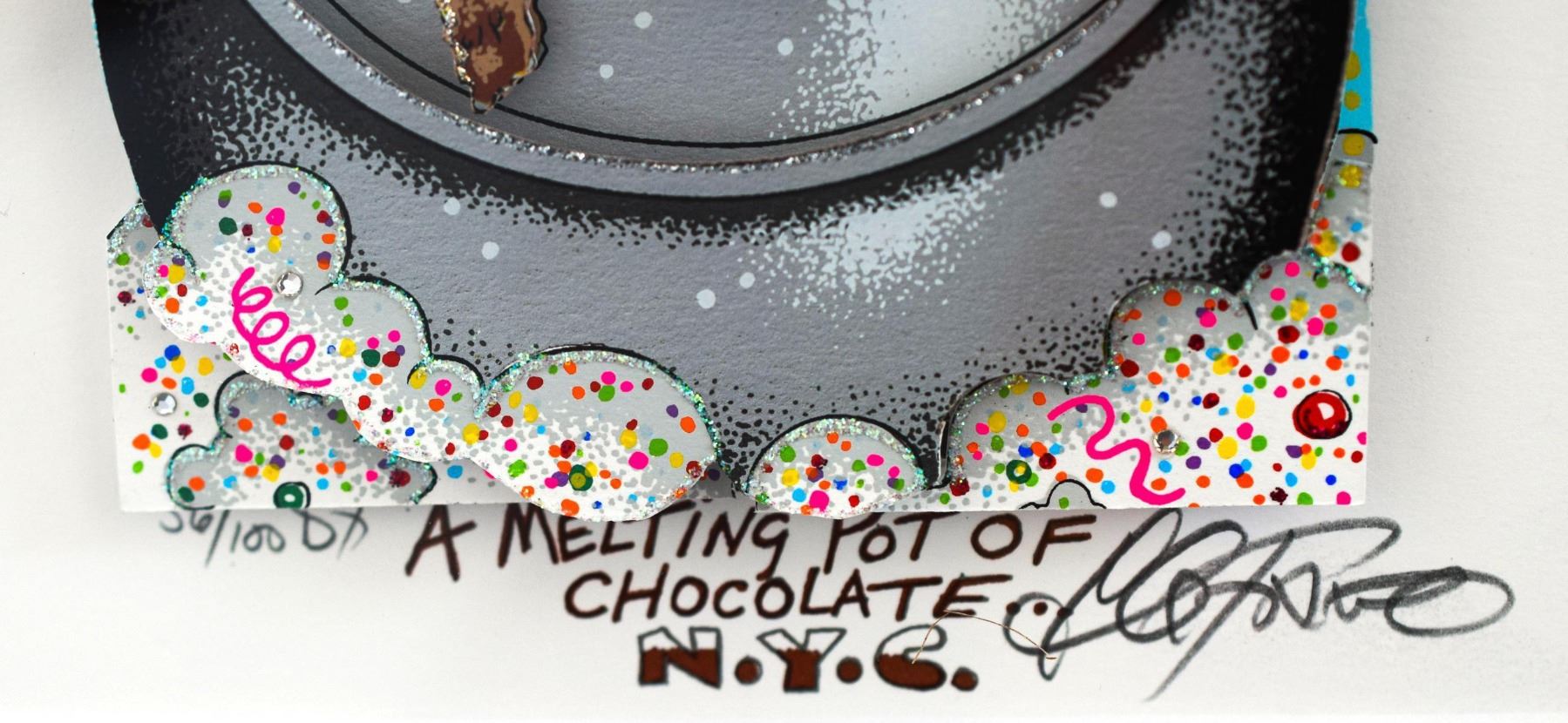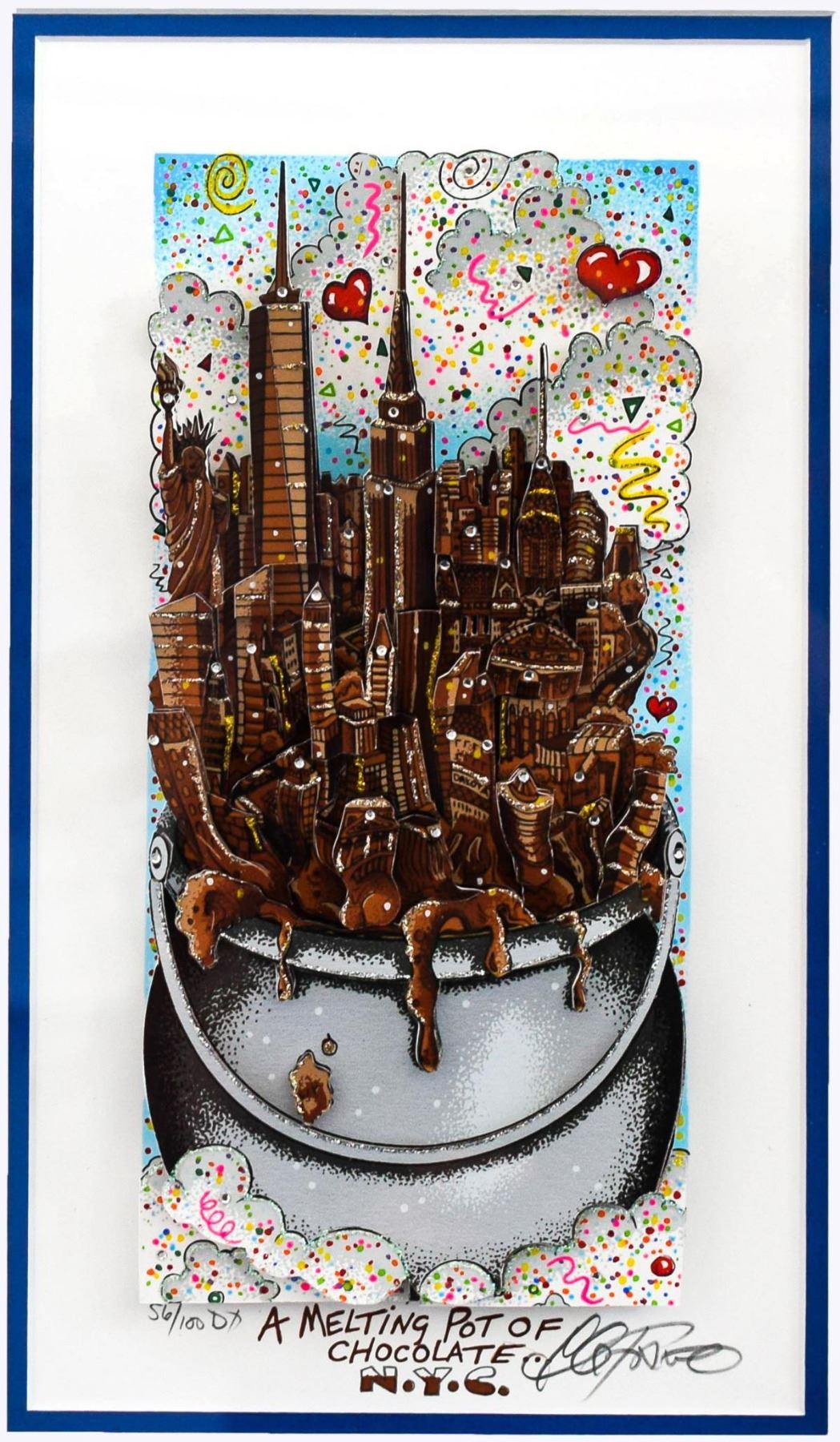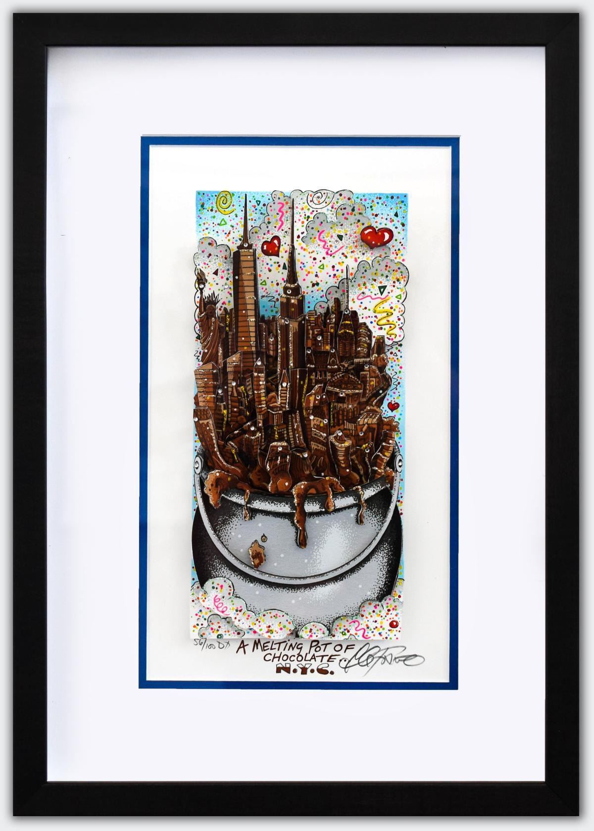Artist: Charles Fazzino. Medium: 3D Construction Silkscreen Serigraph. Title: A MELTING POT OF CHOCOLATE…NYC. Size (Unframed): 13" x 7.5". Size (Framed): 19" x 13.5". Limited Edition: Edition of 100 DX. Certificate of Authenticity: From the publisher. Additional: Custom framed. Reference# 16159.