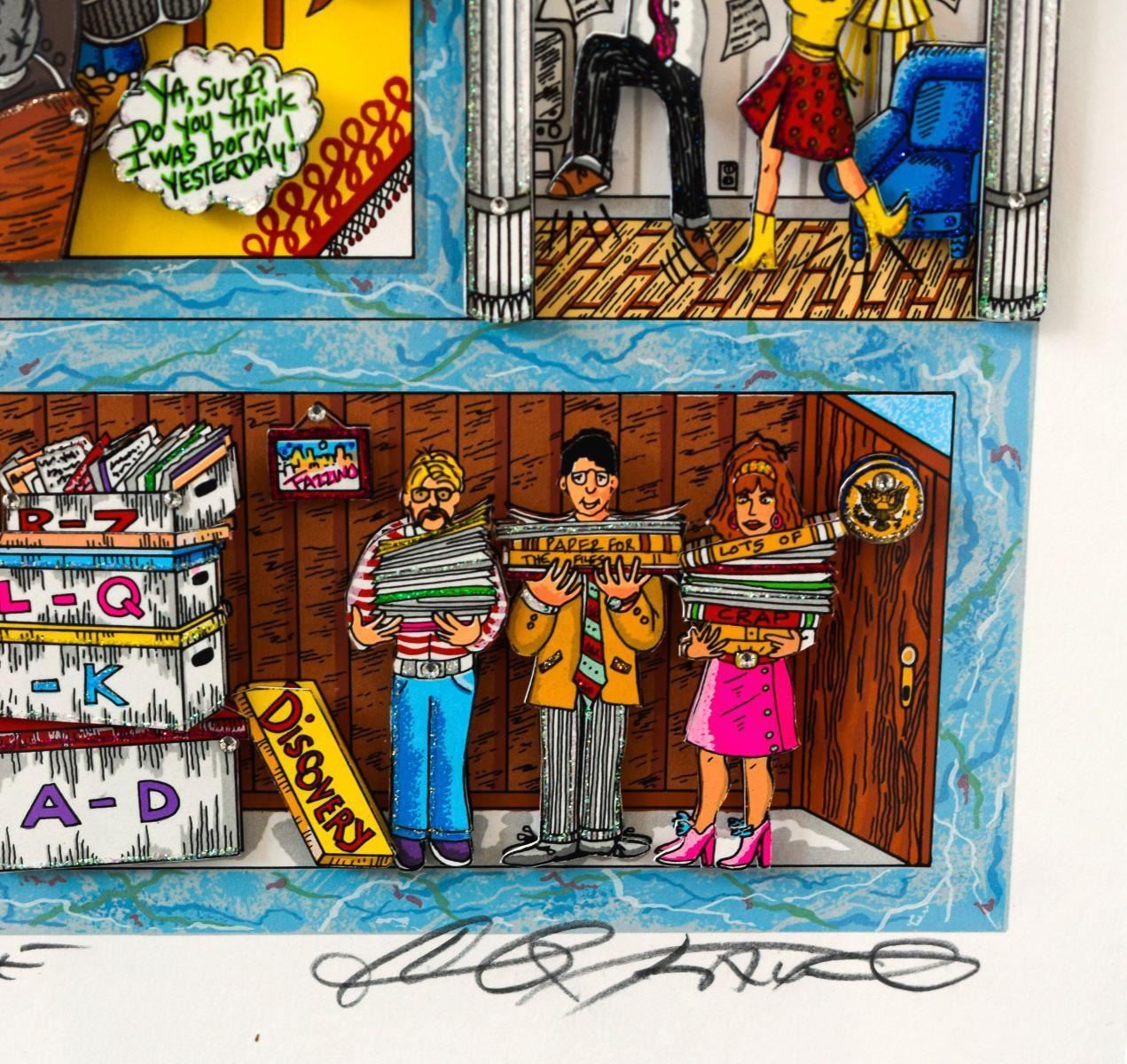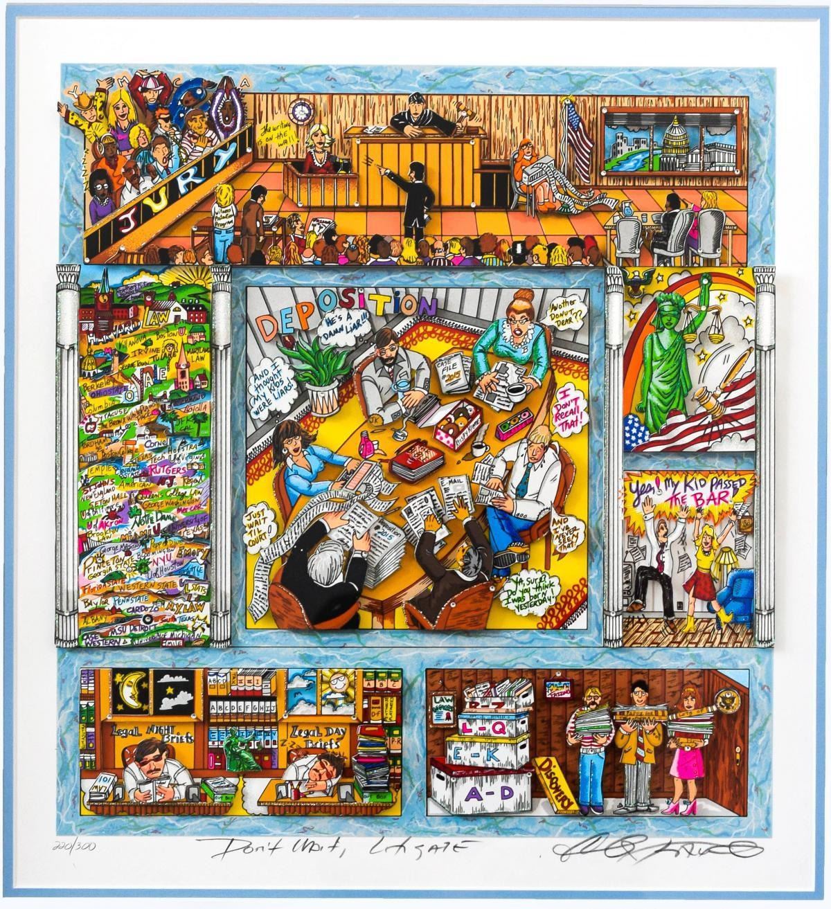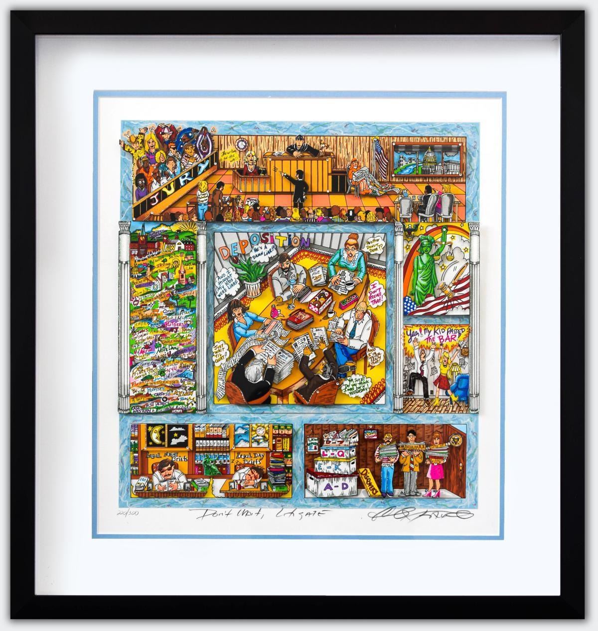 Artist: Charles Fazzino. Medium: 3D Construction Silkscreen Serigraph. Title: Don't Wait, Litigate. Size (Unframed): 18" x 17". Size (Framed): 25" x 24". Limited Edition: Edition of 300. Certificate of Authenticity: From the publisher. Additional: Custom framed. Reference# 16201.