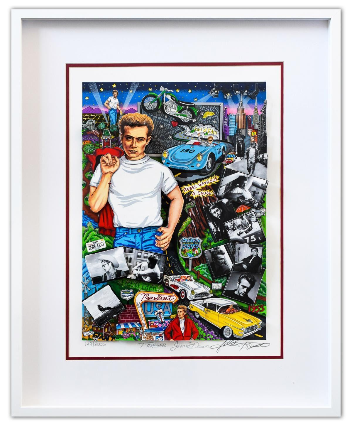 Artist: Charles Fazzino. Medium: 3D Construction Silkscreen Serigraph. Title: Forever James Dean. Size (Unframed): 18.75" x 13". Size (Framed): 31" x 25". Limited Edition: Edition of 300 DX. Certificate of Authenticity: From the publisher. Additional: Custom Framed. Reference# 13857.