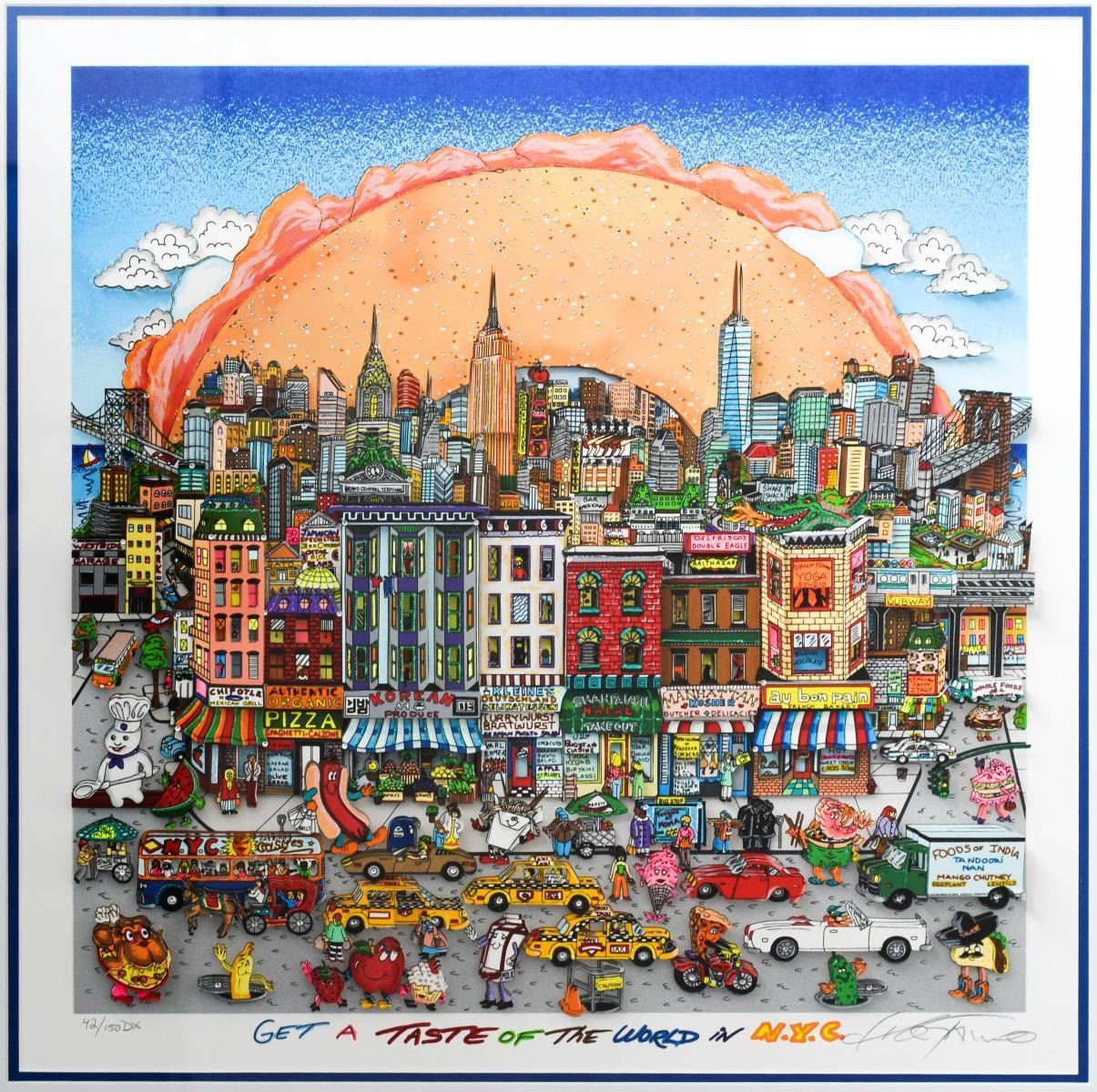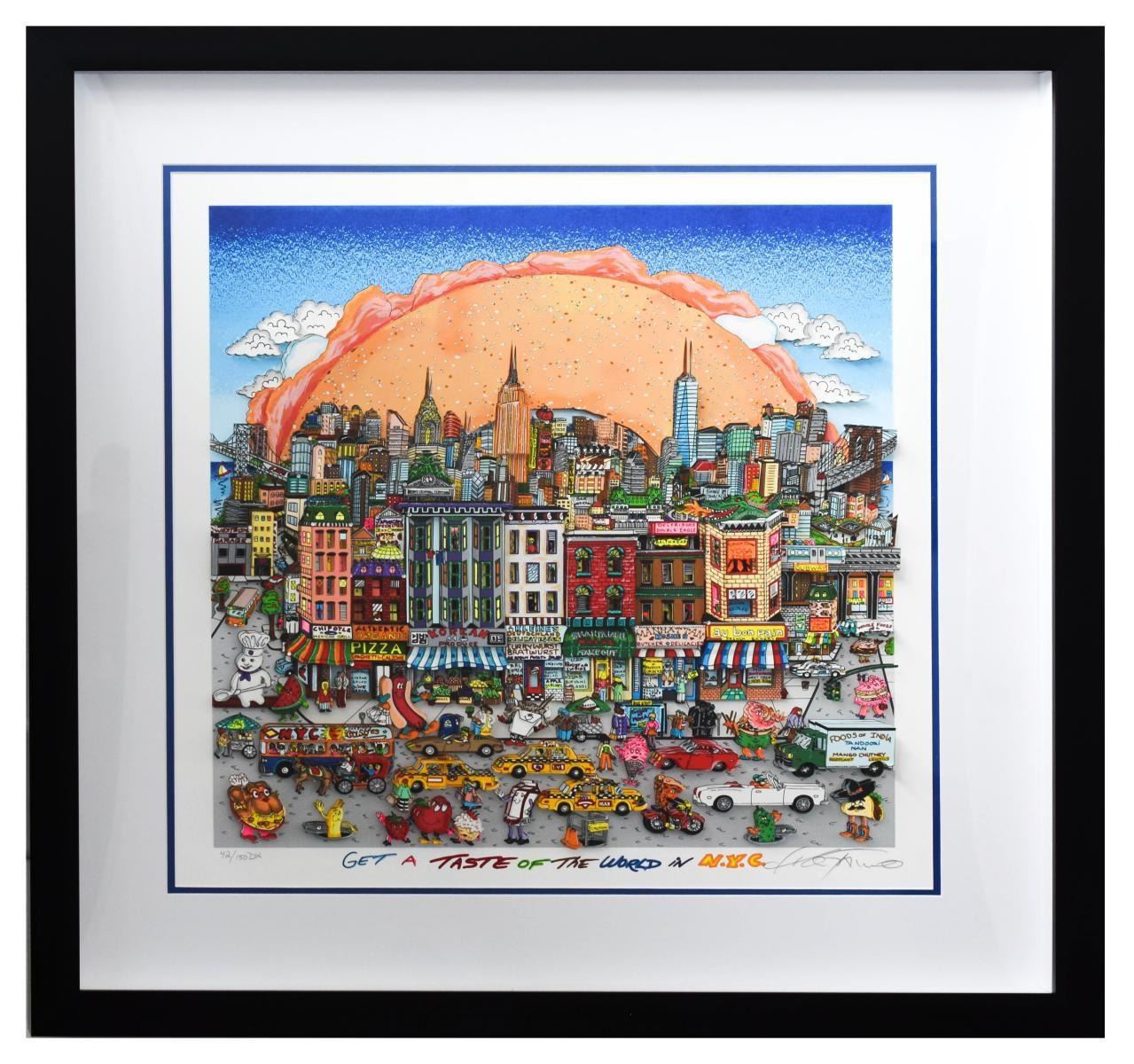 Artist: Charles Fazzino. Medium: 3D Construction Silkscreen Serigraph. Title: Get A Taste of the World in N.Y.C. Size (Unframed): 25" x 24". Size (Framed): 34" x 33.5". Limited Edition: Edition of 150 DX. Certificate of Authenticity: From the publisher. Additional: Custom Framed. Reference# 12490.