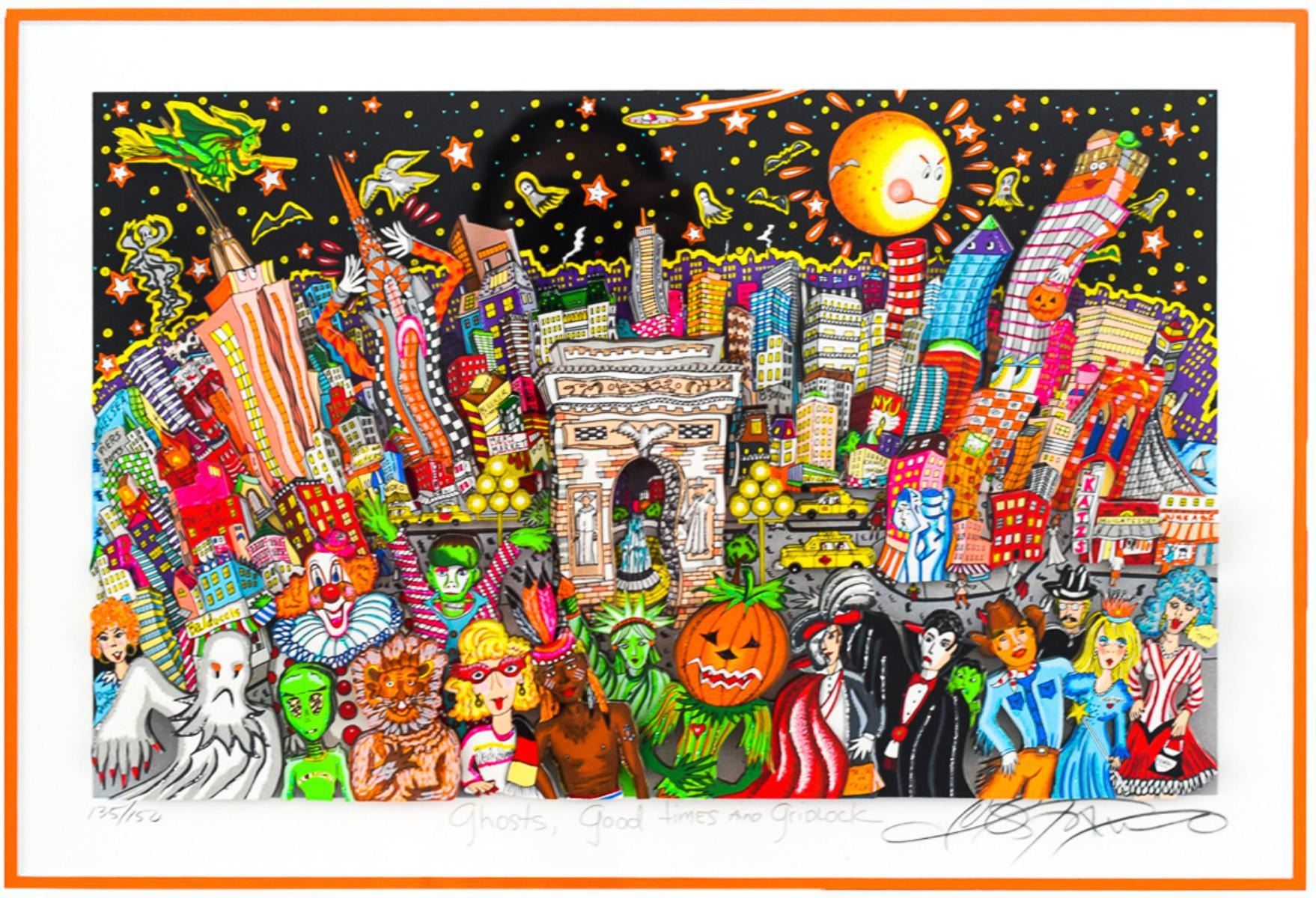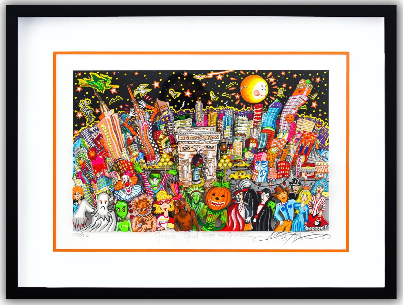 Artist: Charles Fazzino. Medium: 3D Construction Silkscreen Serigraph. Title: Ghosts, Good Times, and Gridlock. Size (Unframed): 12" x 18". Measures approx. (Framed): 18.5" x 24.5". Limited Edition: Edition of 150. Certificate of Authenticity: From the publisher. Additional: Custom framed. Reference# 16969.