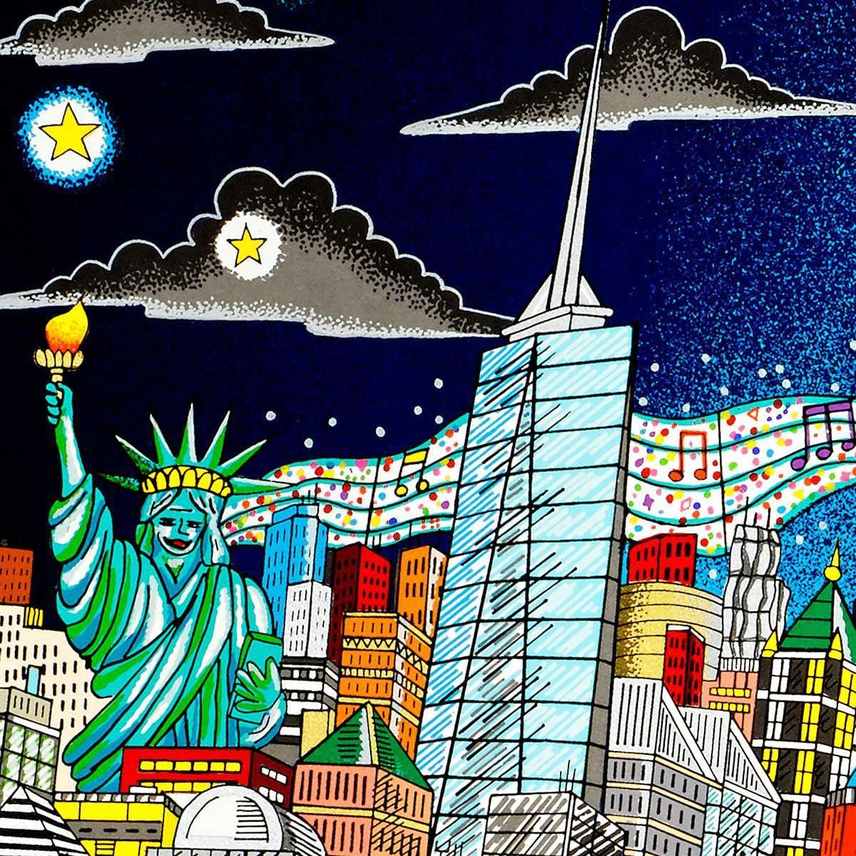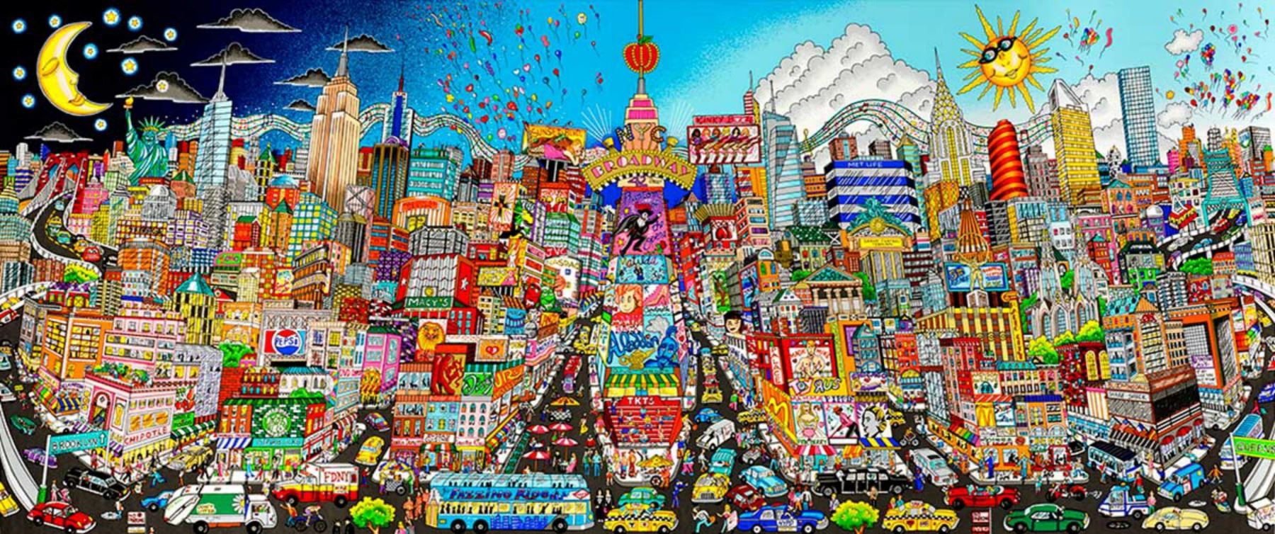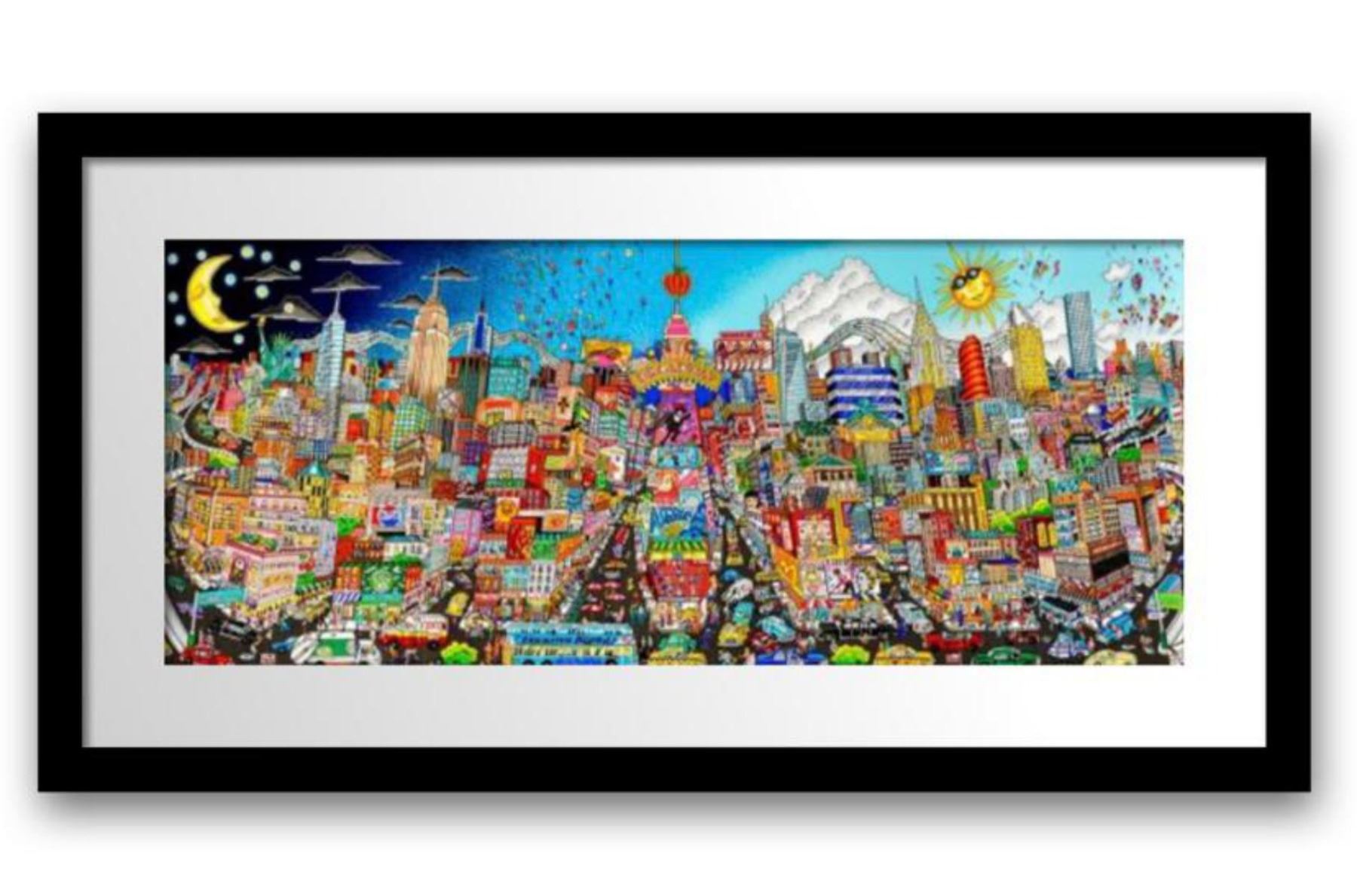 Artist: Charles Fazzino. Medium: 3D Construction Silkscreen Serigraph. Title: NIGHT OR DAY…FEEL THE RHYTHM OF BROADWAY. Size (Unframed): 28" x 68". Measures approx. (Framed): 36" x 76". Certificate of Authenticity: From the publisher. Reference# 13546.