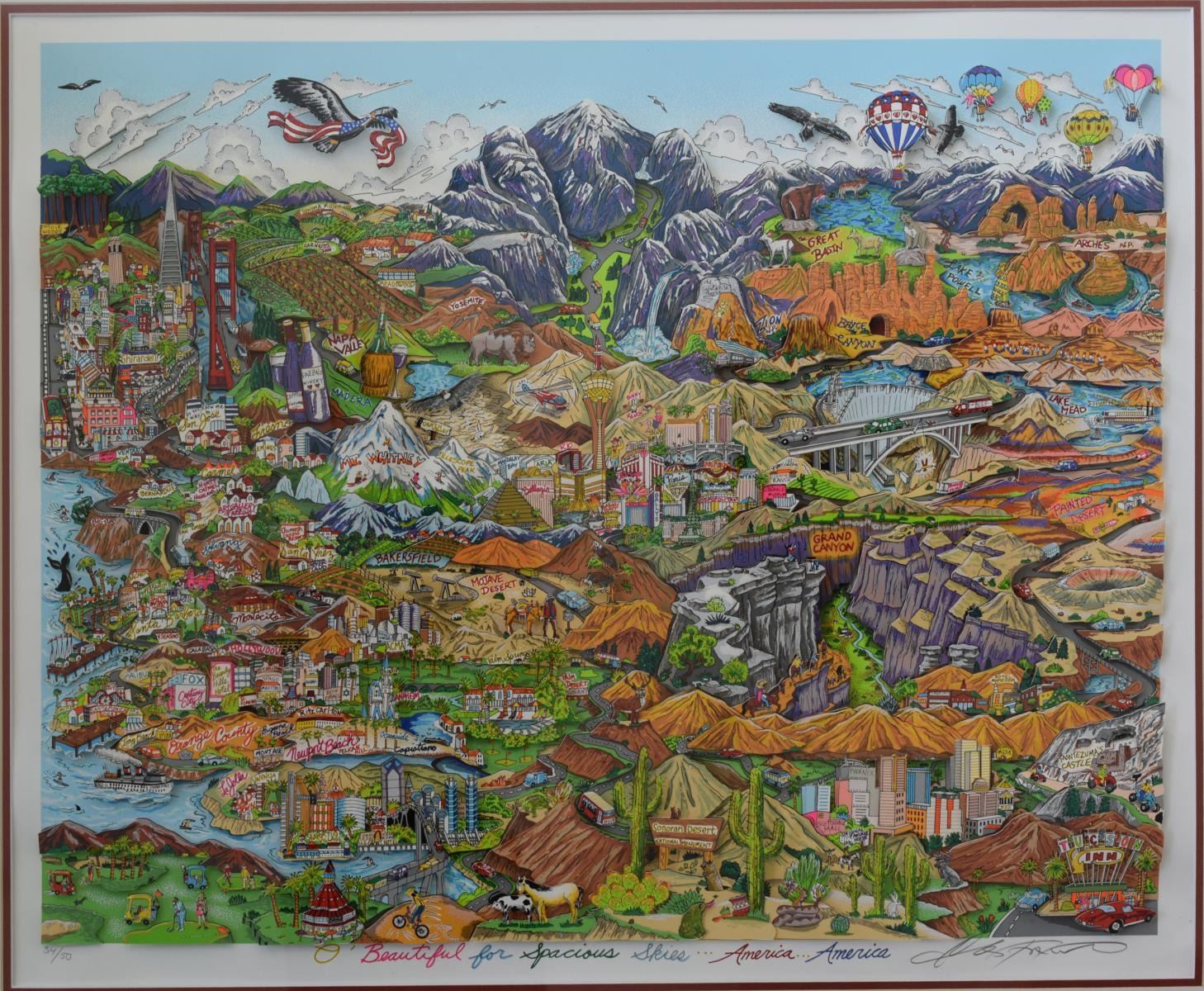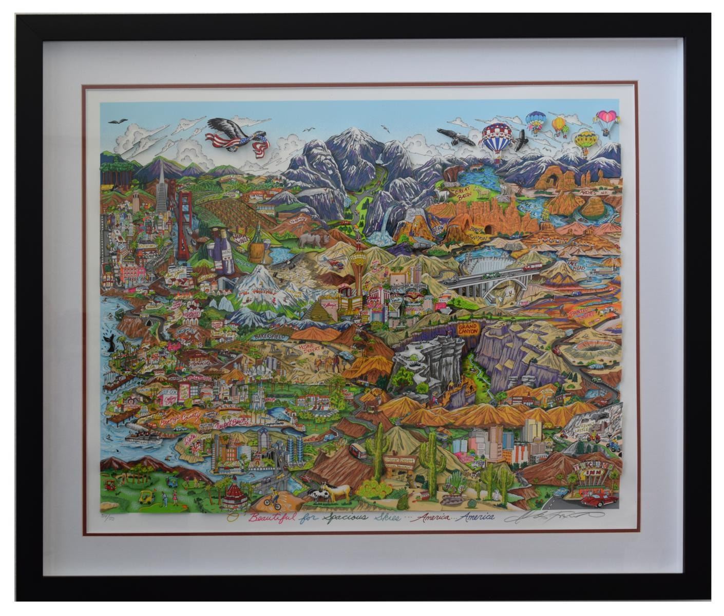 Artist: Charles Fazzino. Medium: 3D Construction Silkscreen Serigraph. Title: O BEAUTIFUL FOR SPACIOUS SKIES…AMERICA…AMERICA. Size (Unframed): 24" x 30". Size (Framed): 35" x 40". Limited Edition: Edition of 50. Certificate of Authenticity: From the publisher. Additional: Custom Framed. Reference# 11293.