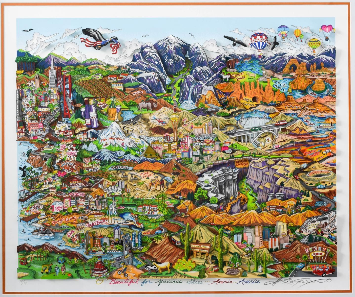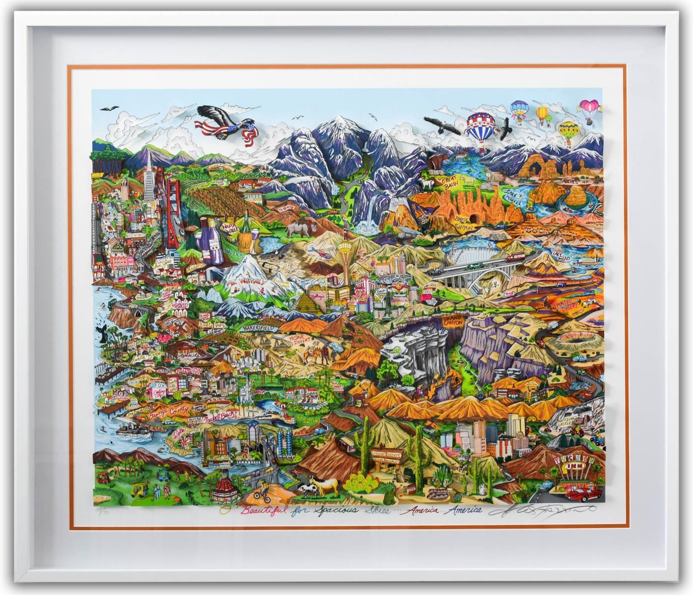 Artist: Charles Fazzino. Medium: 3D Construction Silkscreen Serigraph. Title: O BEAUTIFUL FOR SPACIOUS SKIES…AMERICA…AMERICA. Size (Unframed): 26" x 31". Size (Framed): 34" x 39". Limited Edition: Edition of 50. Certificate of Authenticity: From the publisher. Additional: Custom Framed. Reference# 12482.