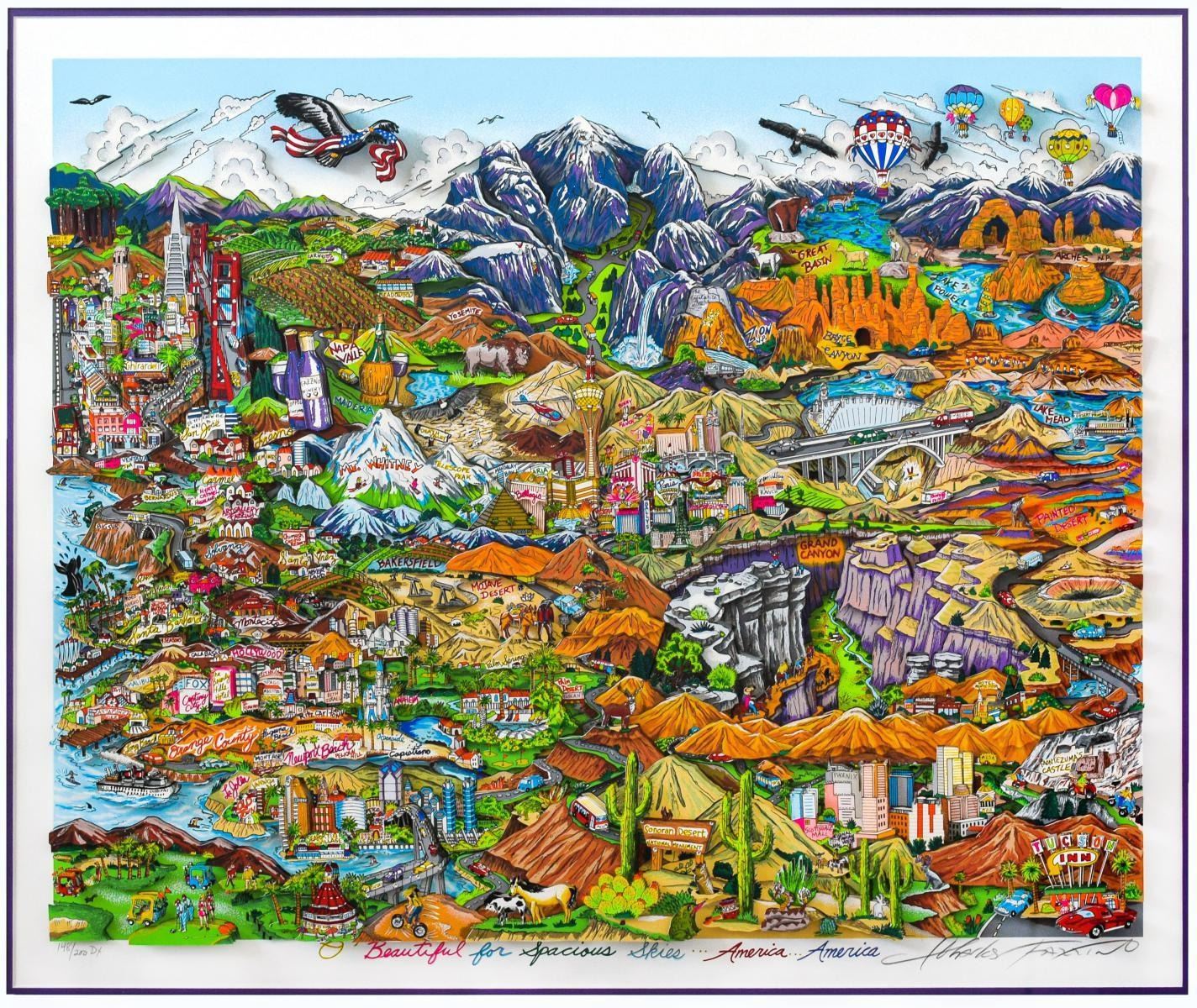 Artist: Charles Fazzino. Medium: 3D Construction Silkscreen Serigraph. Title: O BEAUTIFUL FOR SPACIOUS SKIES…AMERICA…AMERICA. Size (Unframed): 26" x 31". Size (Framed): 34" x 39". Limited Edition: Edition of 200 DX. Certificate of Authenticity: From the publisher . Additional: Custom framed. Reference# 15268.