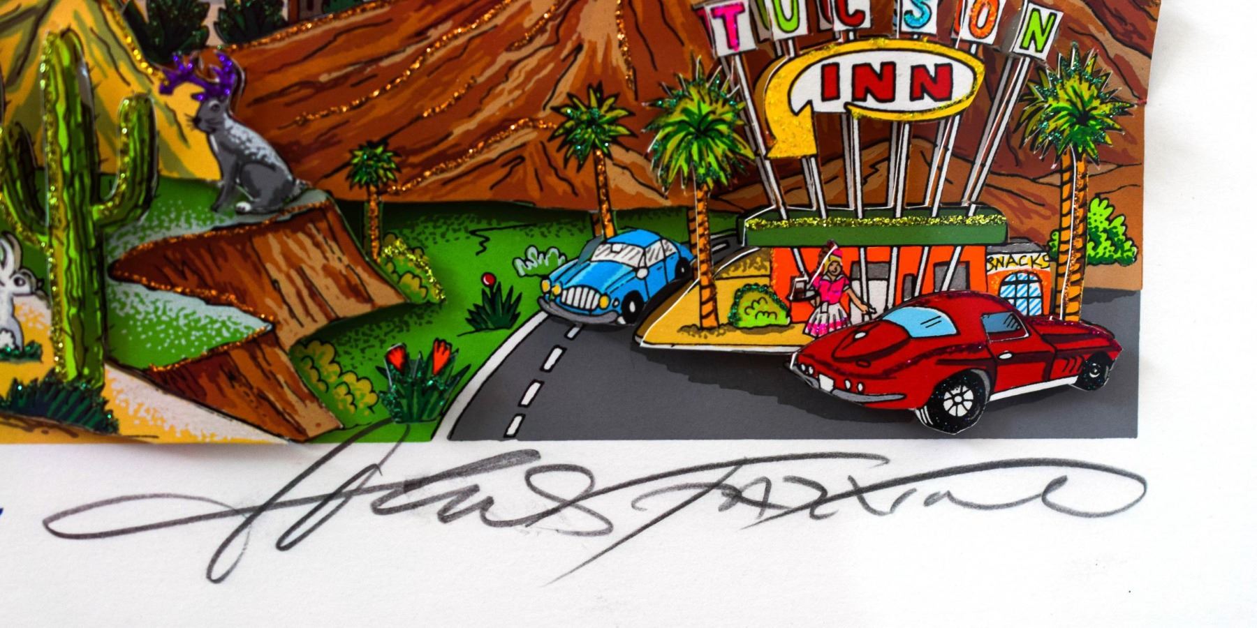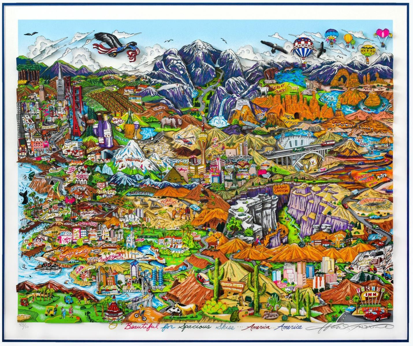 Artist: Charles Fazzino. Medium: 3D Construction Silkscreen Serigraph. Title: O BEAUTIFUL FOR SPACIOUS SKIES…AMERICA…AMERICA. Size (Unframed): 26" x 31". Size (Framed): 34" x 39". Limited Edition: Edition of 50. Certificate of Authenticity: From the publisher . Additional: Custom framed. Reference# 15269.